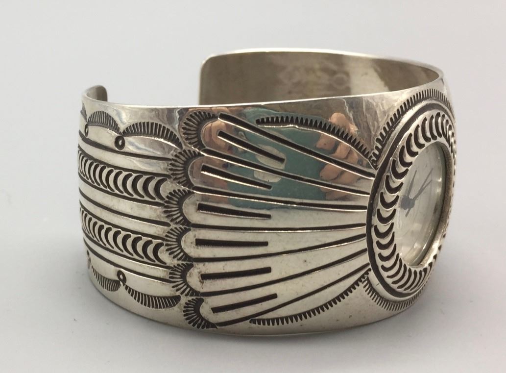 Maker: Carson Blackgoat, Navajo. Approx. Age: Circa 1970s. Size: Measures 5.75” inside plus there is a 1” opening. It’s 1.25” wide and weighs 57g. Condition: Good. NOS. Additional Info: Nice stamp work in sterling silver. Please look closely at the pictures - they are an important part of our description. Shipping: There will be a $5 handling / packaging fee for shipping this lot. The actual cost of postage will be added on top of that.