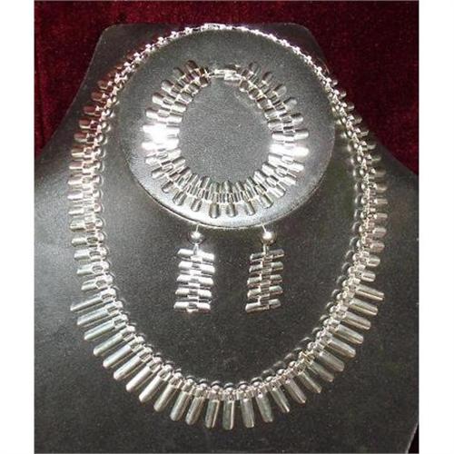 <table width="100%" border="0" cellspacing="0" cellpadding="4"><tr><td><em> This perfectly matched 3 piece set of Sterling Silver is an incrediable find.</em></td></tr><tr> <td width="100%"> Heavily influenced by Art Deco designs and with stunning attention to detail, this gorgeous 3 piece set is both elegant and sophisticated. Marked 925 each piece in this set is a work of art. </td></tr><tr> <td> </td></tr><tr> <td>Reference #: W04163</td></tr><tr><td>Condition:Excellent</td></tr><tr><td>Year:1975</td></tr><tr><td>Title:Sterling Silver Necklace/Bracelet/Earring Set</td></tr><tr><td>Materials:Sterling Silver</td></tr><tr><td>Location:Yuba City, California</td></tr></table>