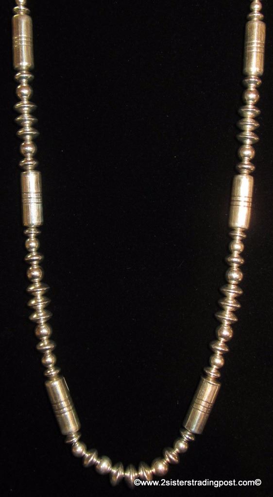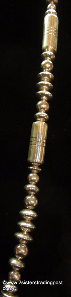24 inch Sterling silver necklace made up of round beads, saucer beads and cylinder beads. Round beads taper from 5 mm to 7.1 mm diameter, saucers range from 5.9 mm to 9.4 mm in diameter and cylinders are 8.4 mm in diameter x 22.3 mm long. Beads are strung on a Sterling chain with cone tips and a hook closure. Necklace weighs 34.8 g, very comfortable weight. Both cone tips are stamped Sterling, piece is not signed.