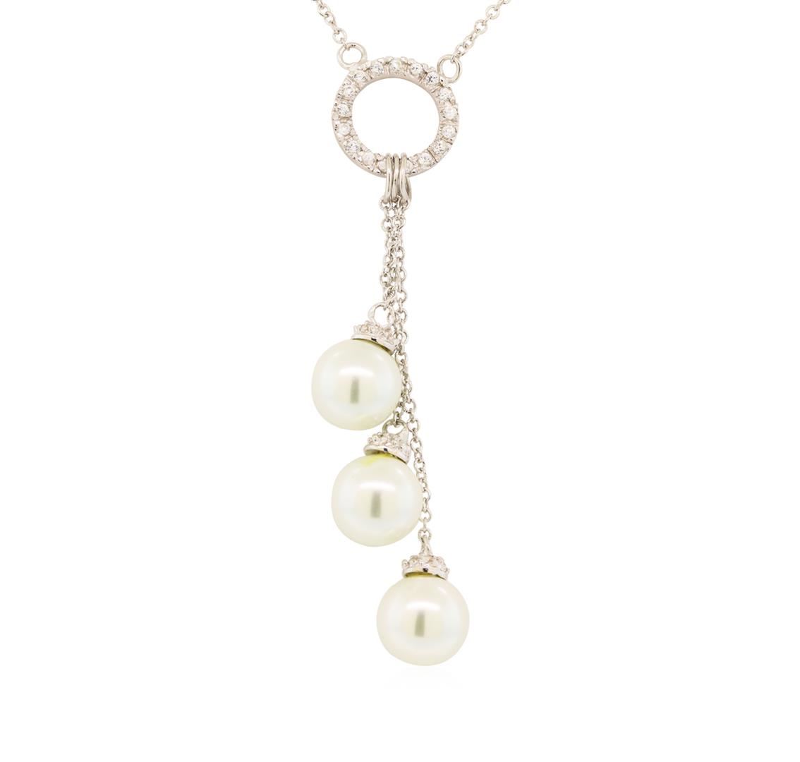 One of a kind high fashion sterling silver Necklace weighing 7.8 grams. Containing: Imitation Pearl, Cubic Zirconia. This sterling silver promises a lasting shine.