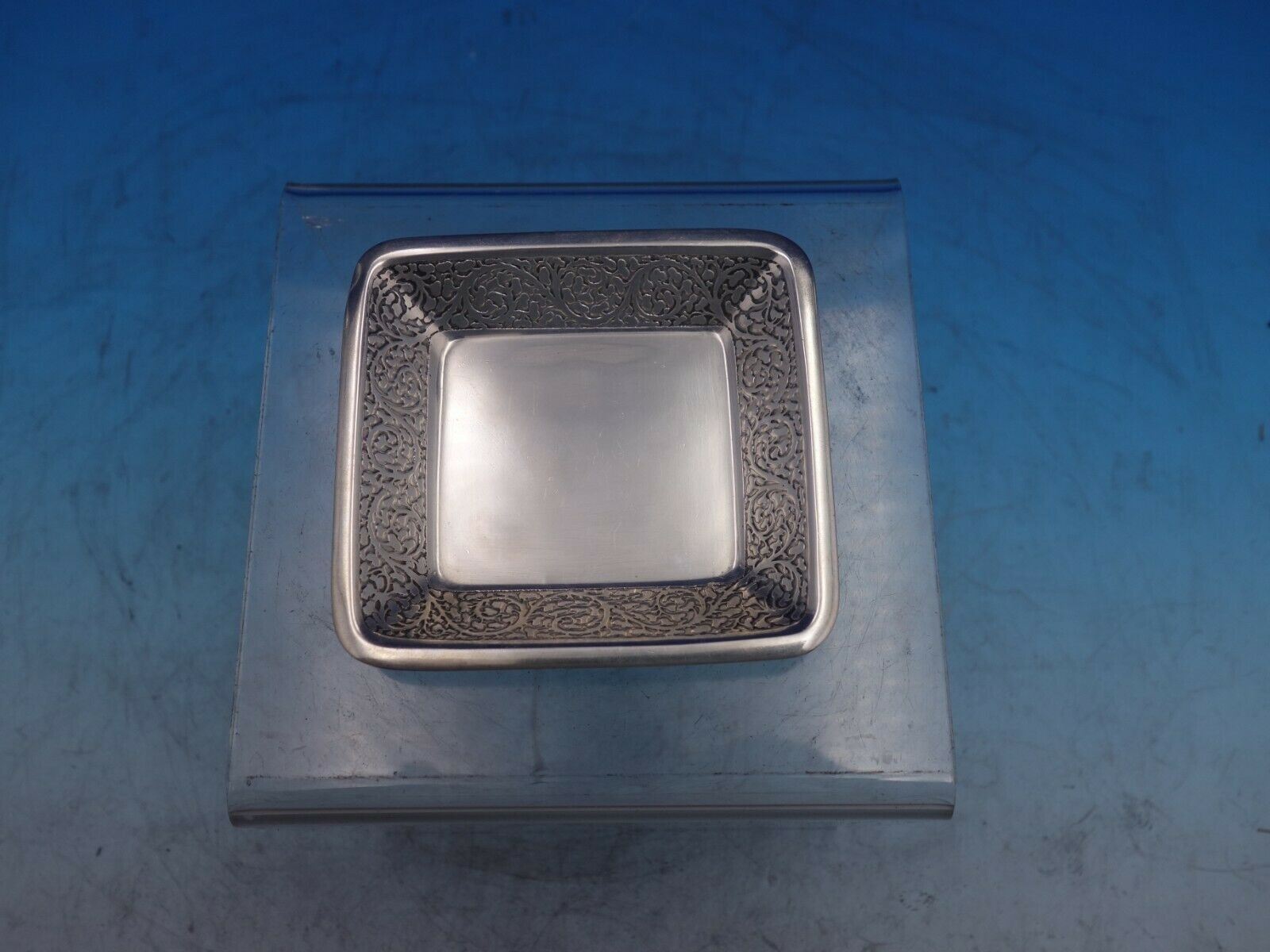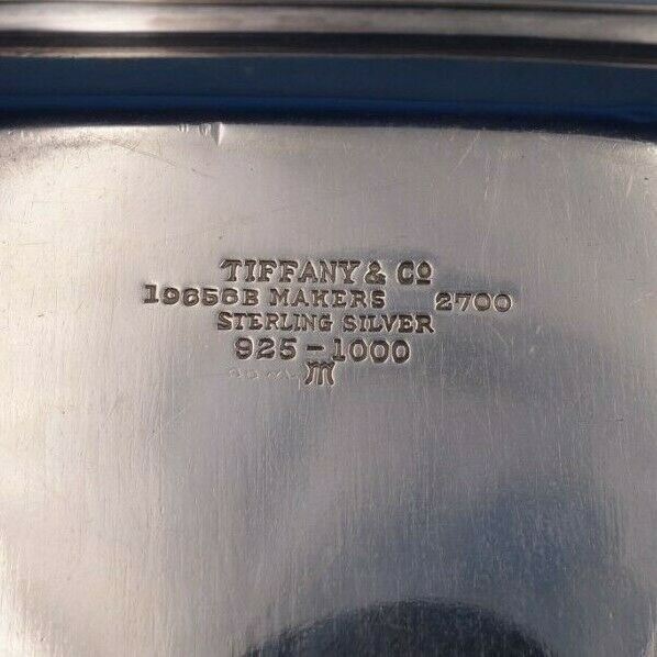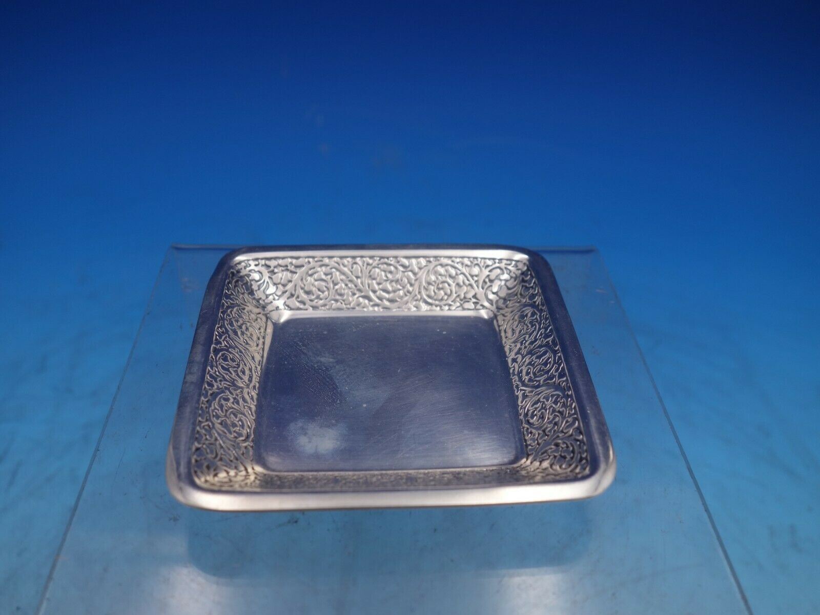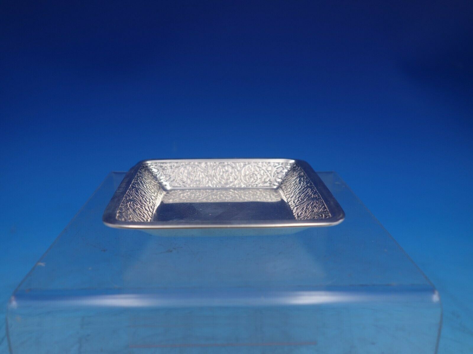 Gorgeous Tiffany and Co sterling silver nut cup with seaweed pattern on edges, marked #10656B2700. This piece measures 3" x 3/8" and weighs 1.97 troy ounces. It is not monogrammed and is in good vintage condition. Fabulous!