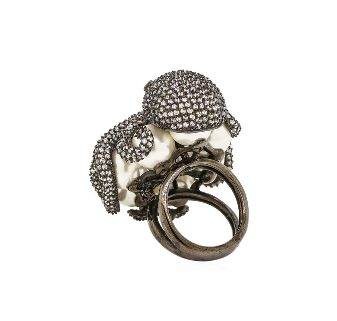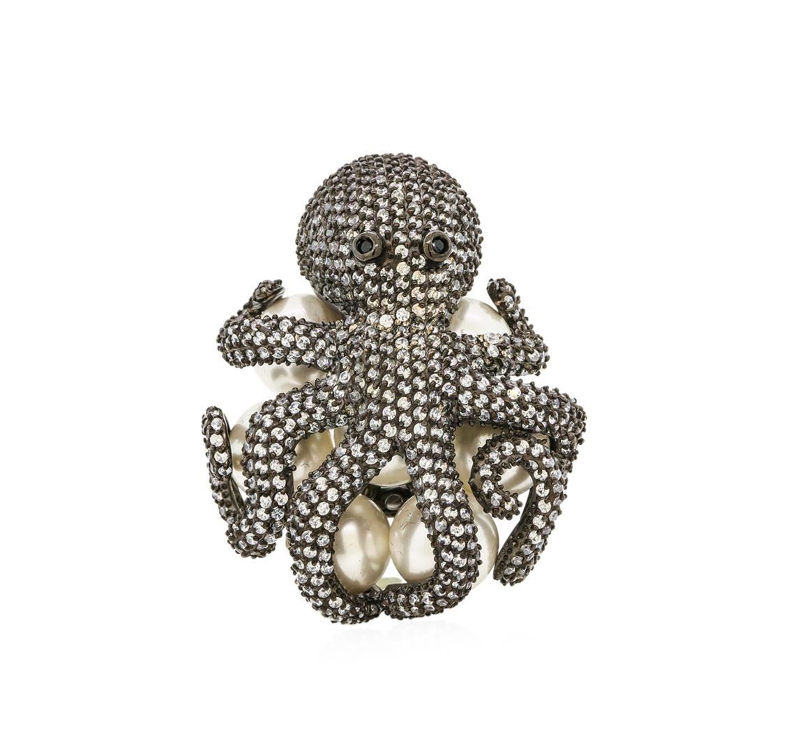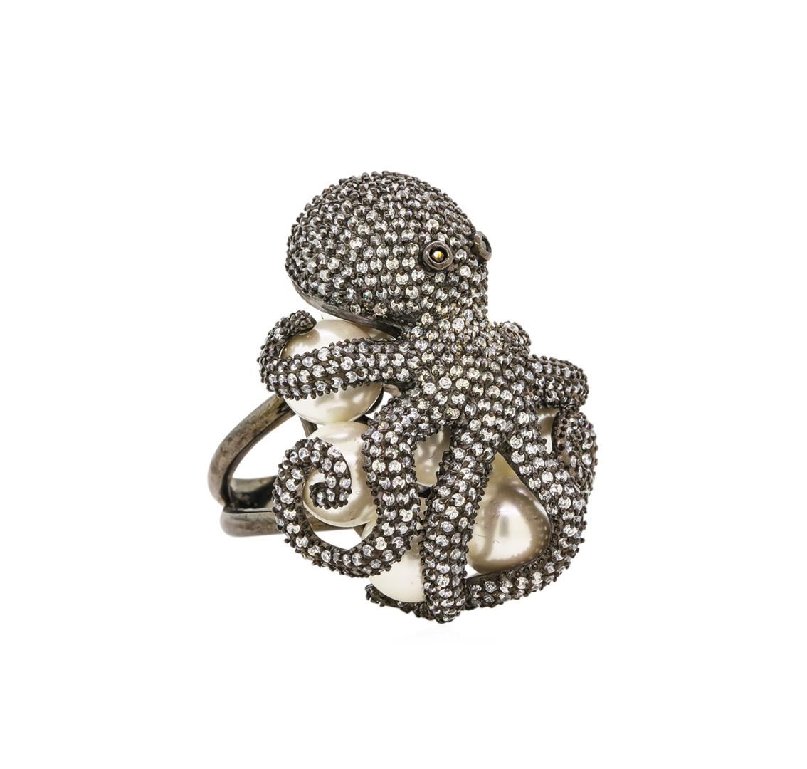 One of a kind high fashion sterling silver Octopus Ring weighing 38.1 grams. Containing: Cubic Zirconia, Black Cubic Zirconia, Imitation Pearl. This sterling silver promises a lasting shine.