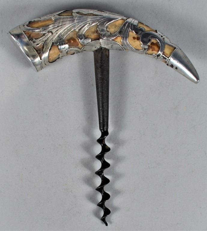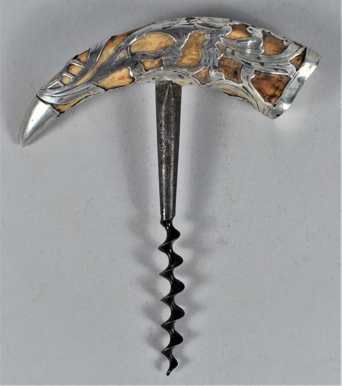 Sterling Silver Overlay Boar's Tusk Cork Screw. Stamped Sterling 658, no hallmark. Fine crack in silver at bottom tip. 4 3/4 inches across.