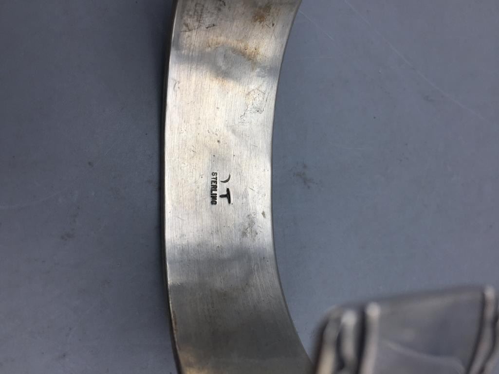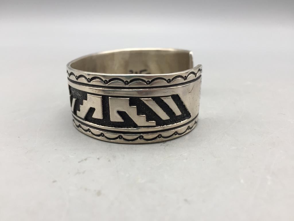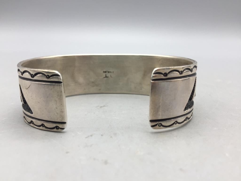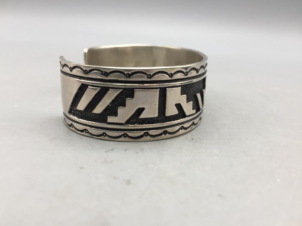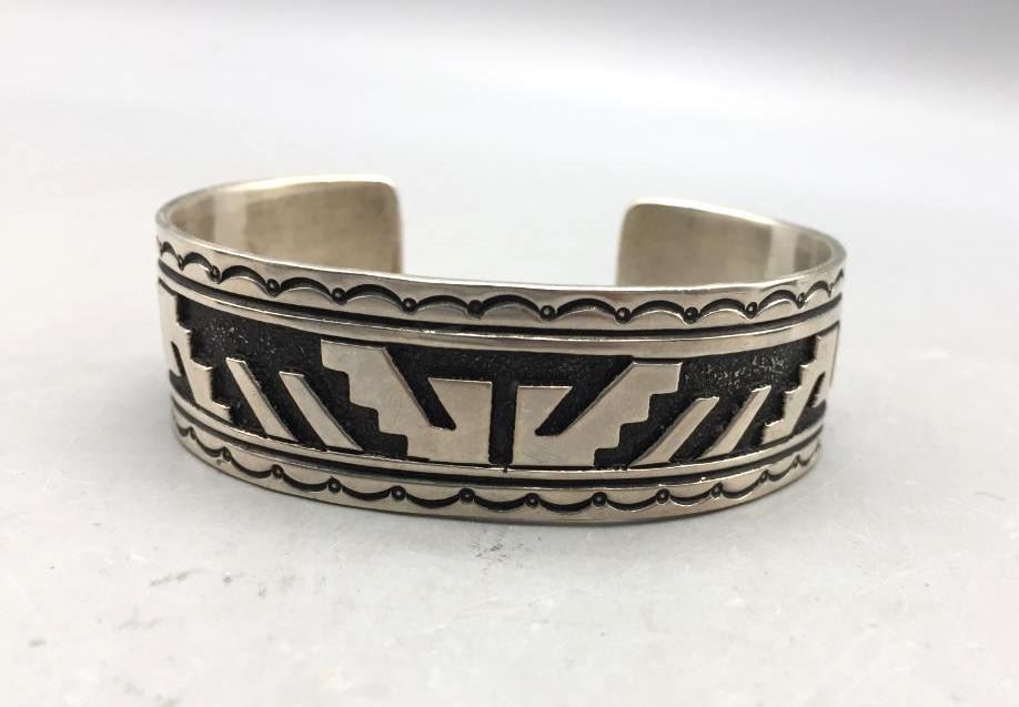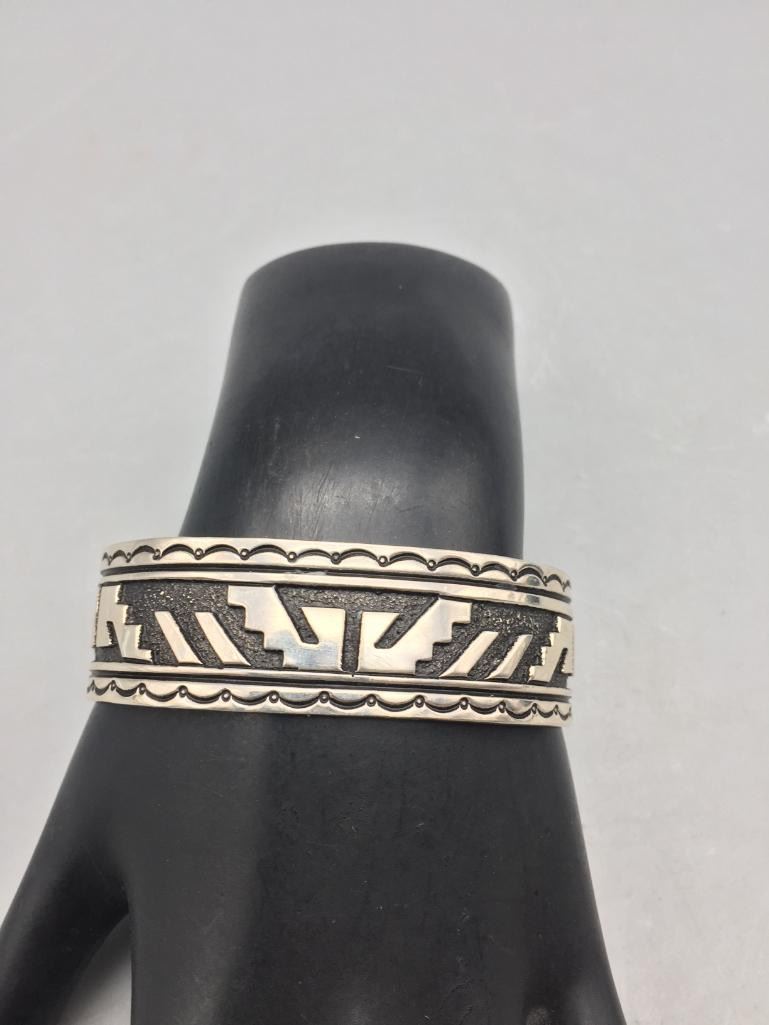 Presented for sale in this lot is a nice sterling silver overlay bracelet with geometric designs, created by Tommy Singer. Maker: Tommy Singer (Navajo, 1940 - 2014). Approx. Age: Fairly modern. Size: Measures 5-7/8" with a 1" opening, fits a 6-7/8" wrist. It is 3/4" wide and weighs 39.2 grams. Condition: Good for its age, normal wear expected. Please look closely at the pictures - they are an important part of our description. Shipping: There will be a $5 handling / packaging fee for shipping this lot. The actual cost of postage will be added on top of that.