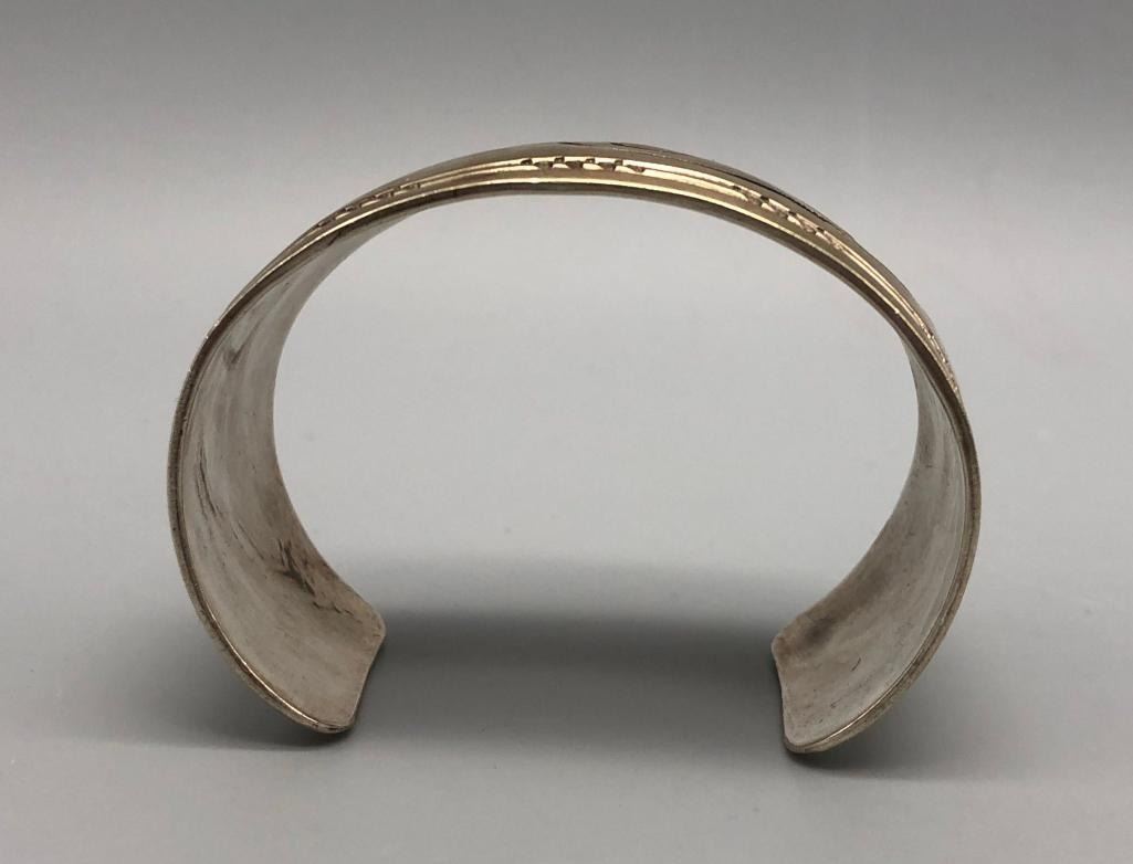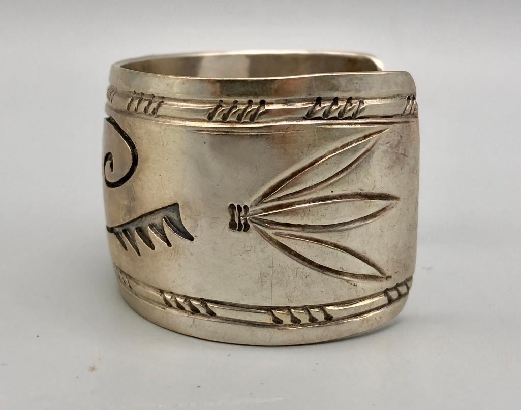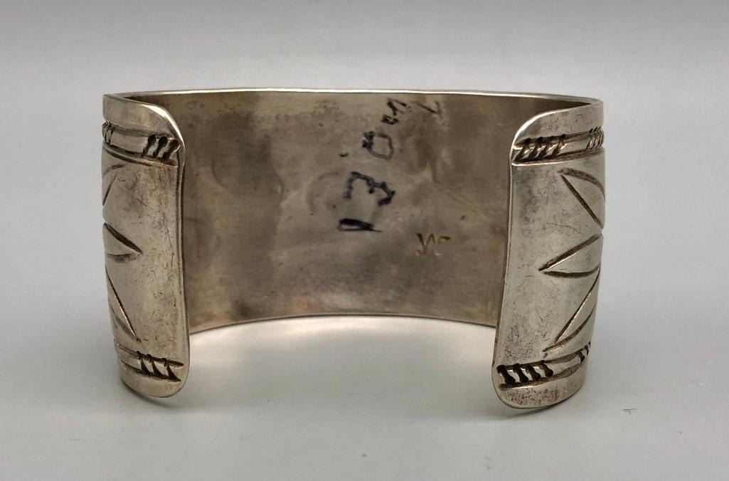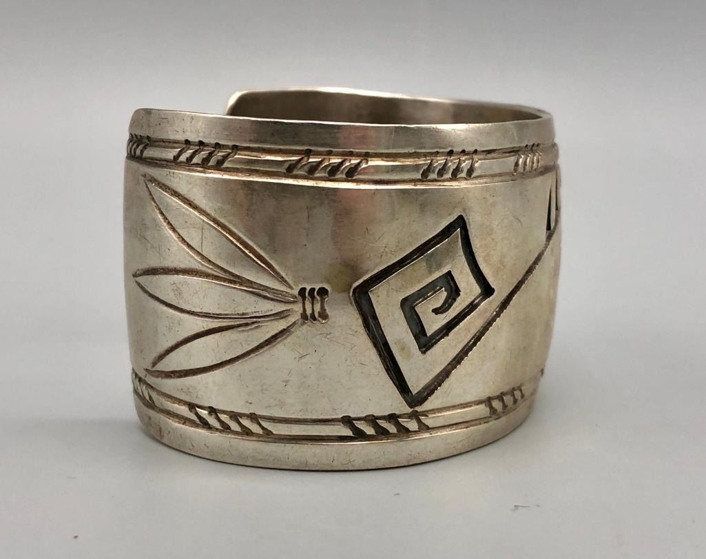 Presented for sale in this lot is a sterling silver overlay bracelet. This is an outstanding bracelet with a nice geometric design. This bracelet features a combination of overlay work and hand stamped designs. It is a nice wide cuff perfect to wear alone or stack with other great pieces. It is made from sterling silver. MAKER: Hallmarked LWE or WE. APPROX AGE: Circa 1970s. SIZE: Inside circumference measures 5-3/4 inches long. Opening is an additional 1-1/2 inches, fitting a 7-1/4 inch wrist. Width is 1-1/2 inches. Weighs 68.4 grams. CONDITION: Good for its age, normal wear expected. Please look closely at the pictures as they are an important part of our description and are hereby incorporated into the description, specifically with regards to condition. SHIPPING: There will be a $5 handling / packaging fee for shipping this lot. The actual cost of postage will be added on top of that. BUY IT NOW: If you would like to buy this item now, without waiting for the auction day to bid on it, we do offer this option (which is available up to 48 hours before the actual auction starts). The “Buy it Now†price is the high estimate of this lot (plus applicable fees and the Buyer's premium is discounted to 10% when using the Buy it Now option). If you would like to exercise this option, you must contact us by email (or phone as long as you talk to someone live). Reference this lot number and your intention to "Buy it Now."