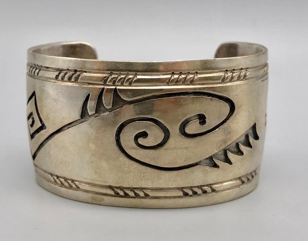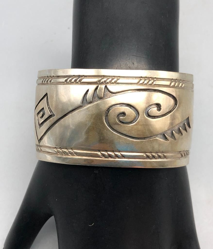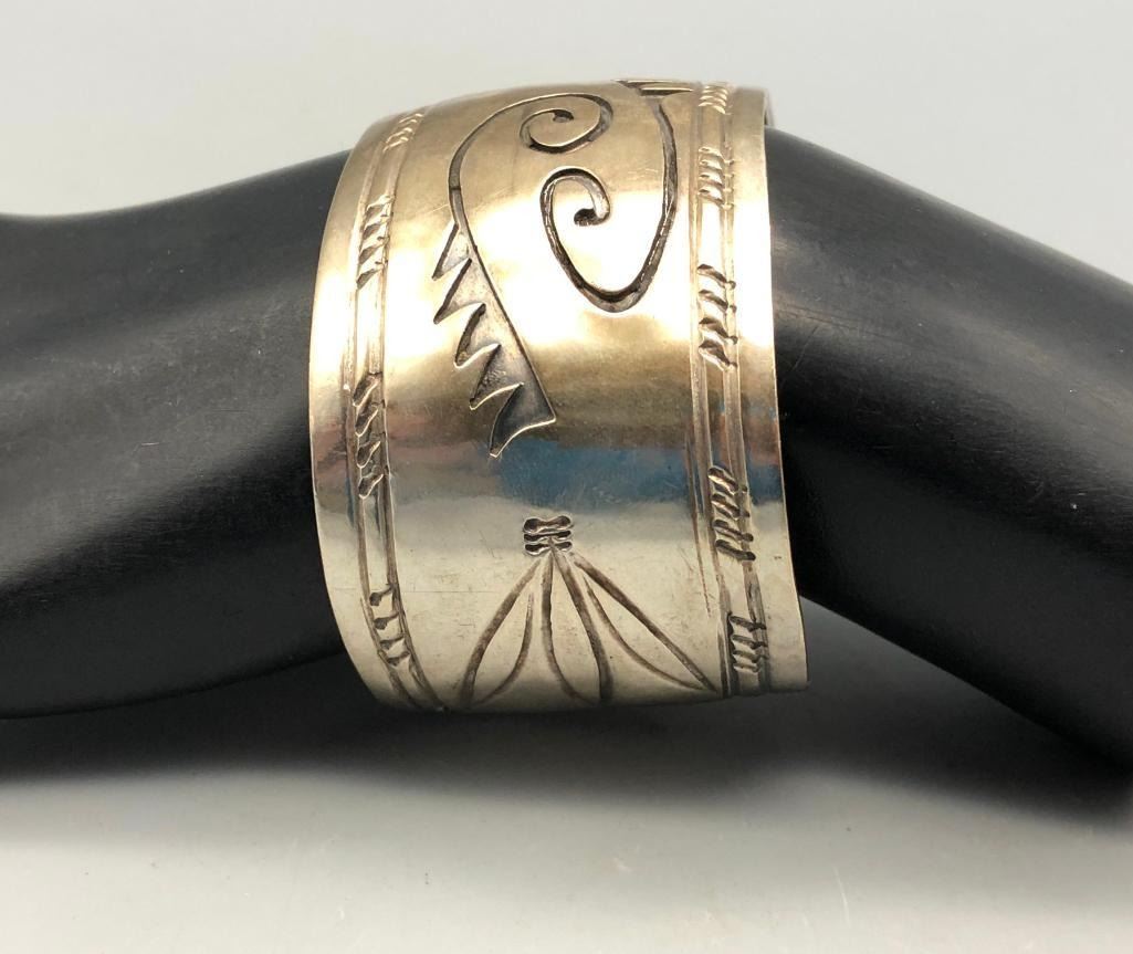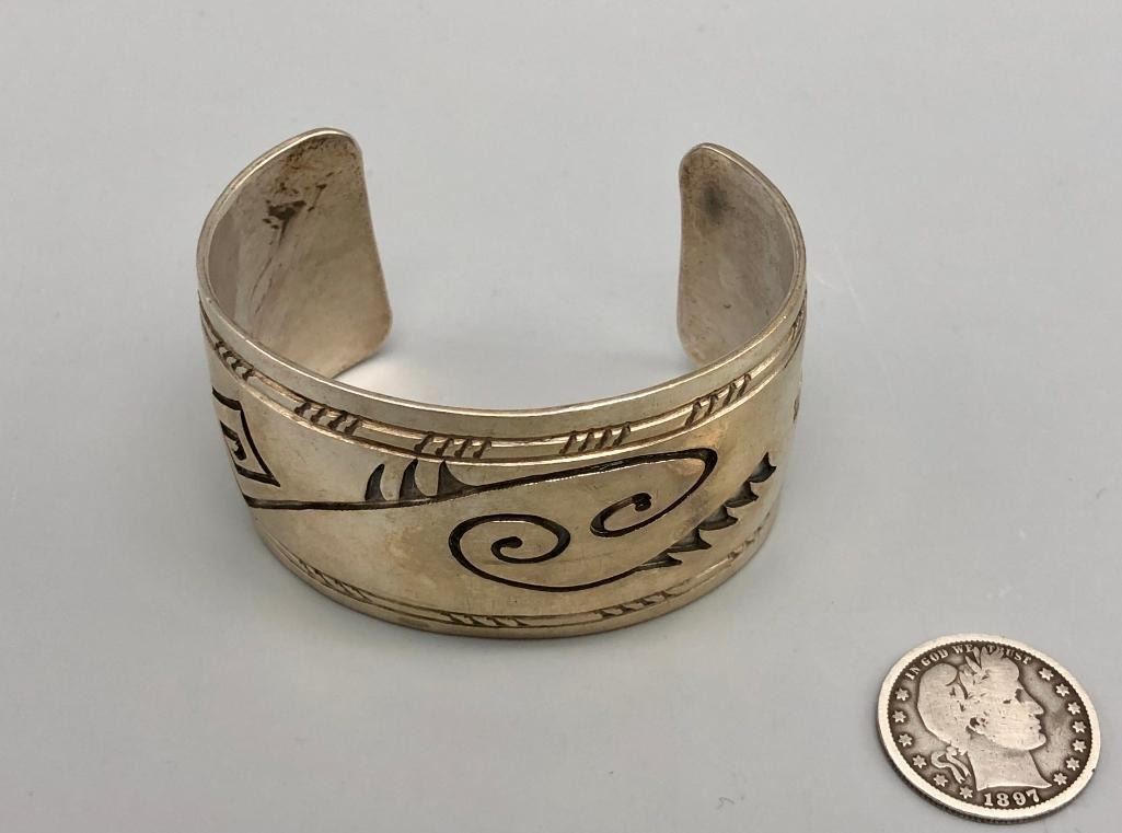 Presented for sale in this lot is a sterling silver overlay bracelet. This is an outstanding bracelet with a nice geometric design. This bracelet features a combination of overlay work and hand stamped designs. It is a nice wide cuff perfect to wear alone or stack with other great pieces. It is made from sterling silver. MAKER: Hallmarked LWE or WE. APPROX AGE: Circa 1970s. SIZE: Inside circumference measures 5-3/4 inches long. Opening is an additional 1-1/2 inches, fitting a 7-1/4 inch wrist. Width is 1-1/2 inches. Weighs 68.4 grams. CONDITION: Good for its age, normal wear expected. Please look closely at the pictures as they are an important part of our description and are hereby incorporated into the description, specifically with regards to condition. SHIPPING: There will be a $5 handling / packaging fee for shipping this lot. The actual cost of postage will be added on top of that. BUY IT NOW: If you would like to buy this item now, without waiting for the auction day to bid on it, we do offer this option (which is available up to 48 hours before the actual auction starts). The “Buy it Now†price is the high estimate of this lot (plus applicable fees and the Buyer's premium is discounted to 10% when using the Buy it Now option). If you would like to exercise this option, you must contact us by email (or phone as long as you talk to someone live). Reference this lot number and your intention to "Buy it Now."