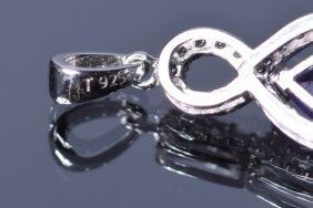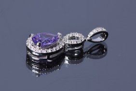 A sterling silver pear shape amethyst pendant. This piece features a large pear cut stone with a swirling hour glass frame trimmed in stones. This item is accompanied with a certificate of authenticity.