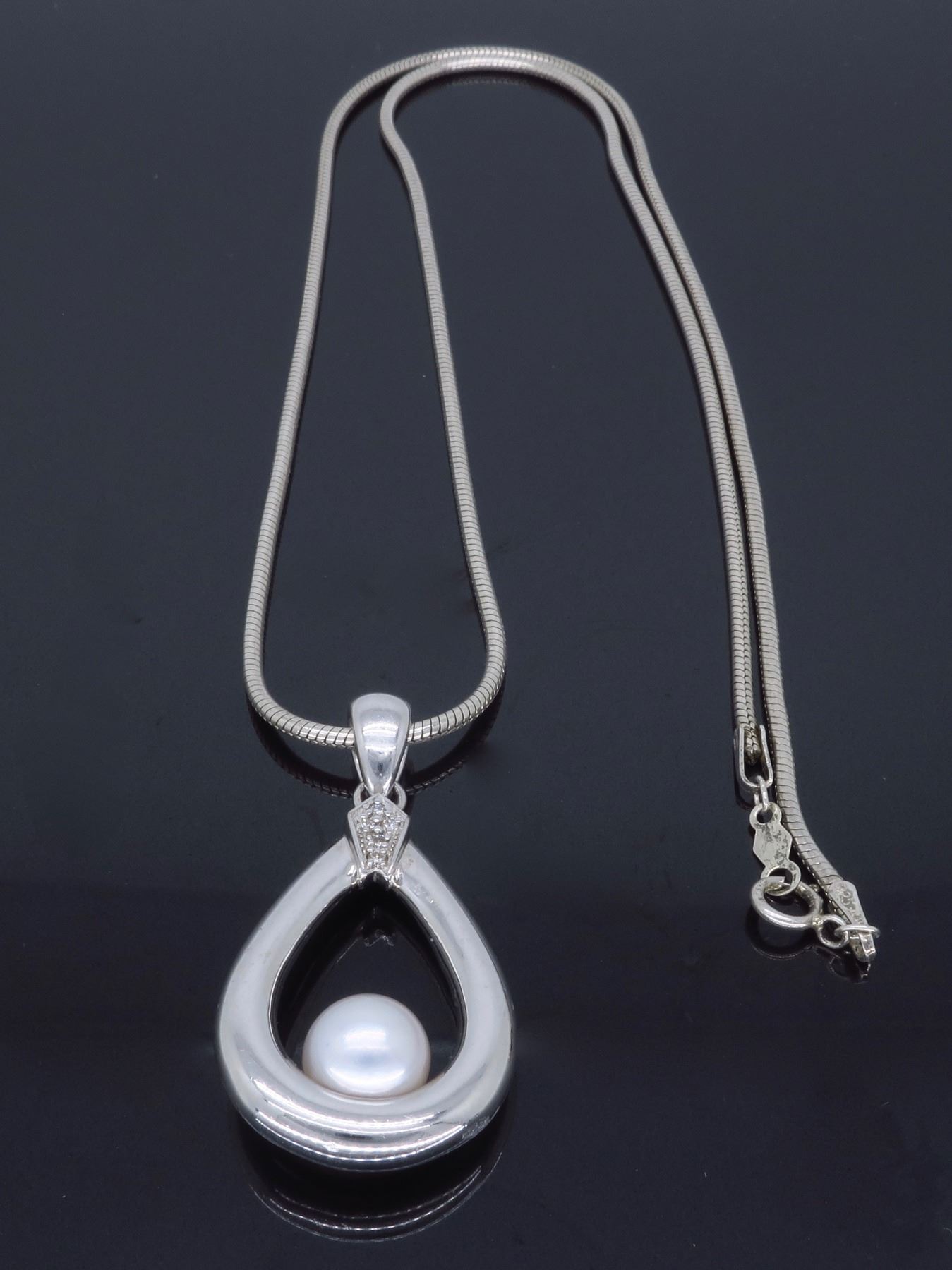 One Sterling Silver Pearl Pendant with Chain. (1) Pearl measuring 7.73mm. Total weight of this pendant with chain is 14.7 grams. Total length of this 1.48mm rope chain is 18 inches.