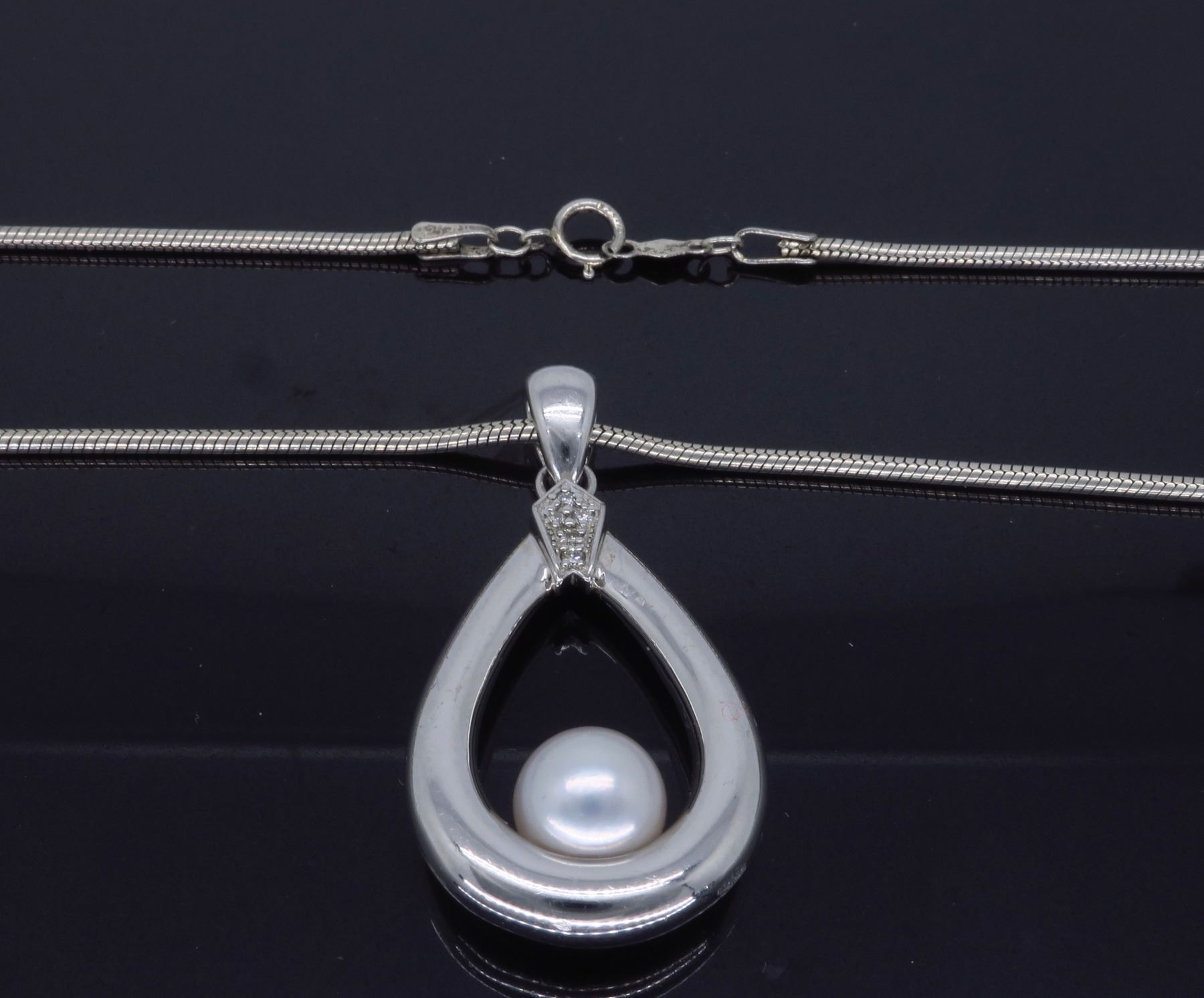 One Sterling Silver Pearl Pendant with Chain. (1) Pearl measuring 7.73mm. Total weight of this pendant with chain is 14.7 grams. Total length of this 1.48mm rope chain is 18 inches.