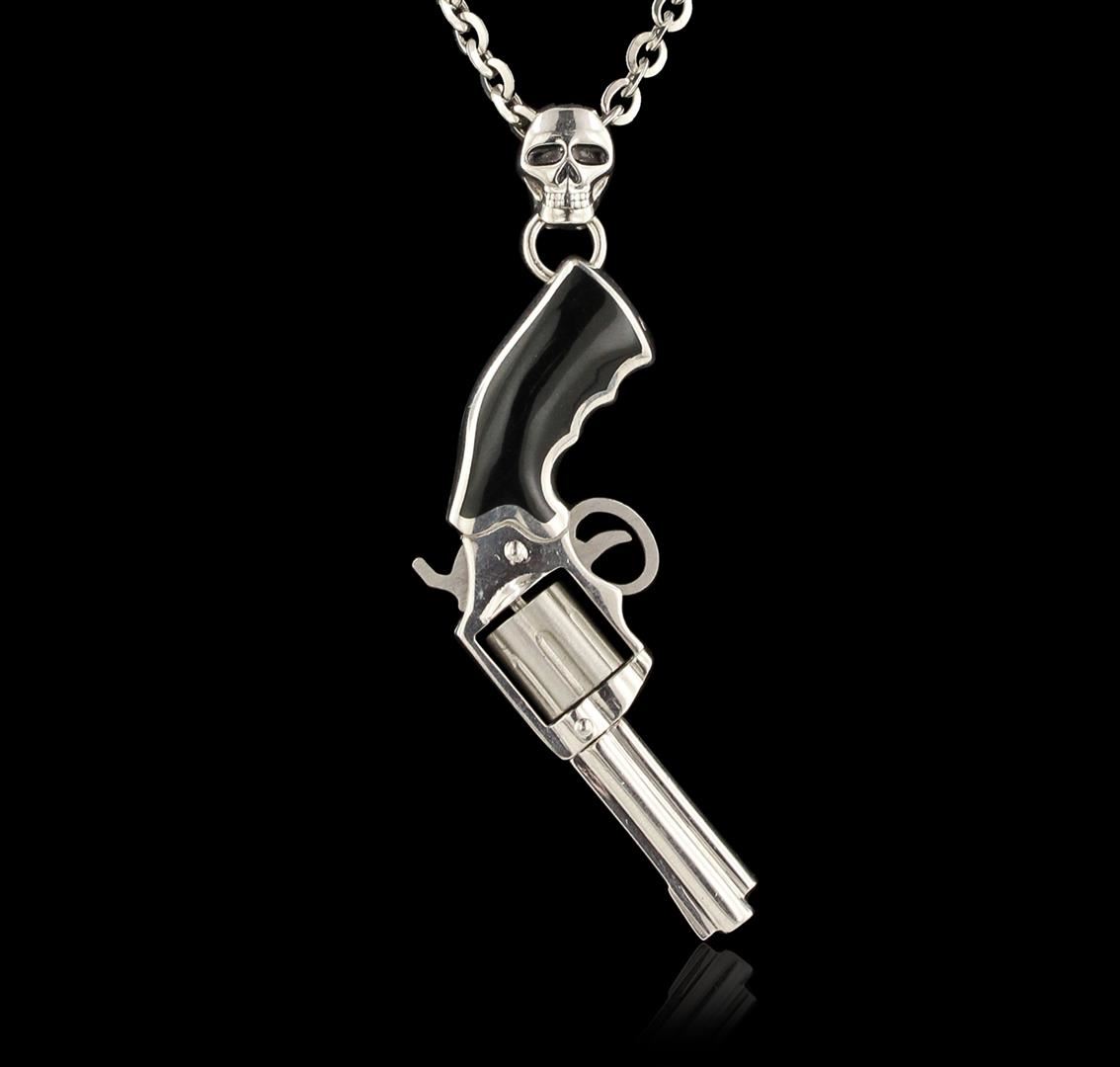 One Sterling Silver gun and skull pendant with black painted handle with chain weighing 31.6 grams.