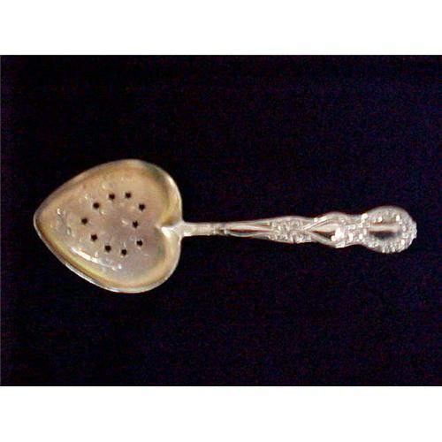 A 5 ¼ inch long sterling silver perforated serving spoon. The bowl is at a 30 degree angle to the handle, is heart shaped, engraved with flowers, perforated with star shaped perforations and is 1 ¾ inches wide at its greatest width. The handle is an attractive complex of flowers, vines and curlicues and is backstamped with ?Sterling? and a mark of an M in a shield flanked by two birds. There are no major scratches or dents but the piece does show some wear.
