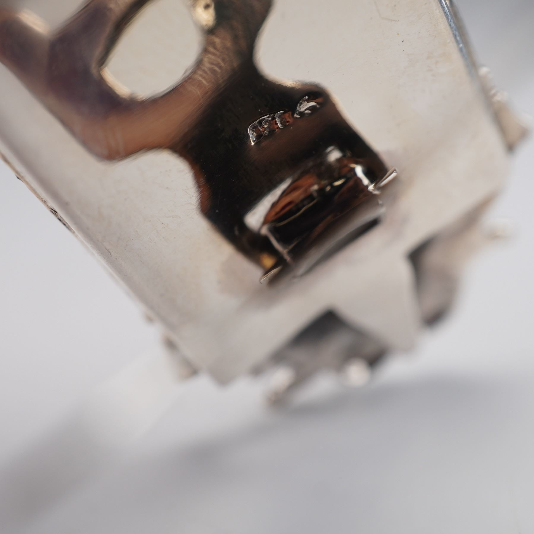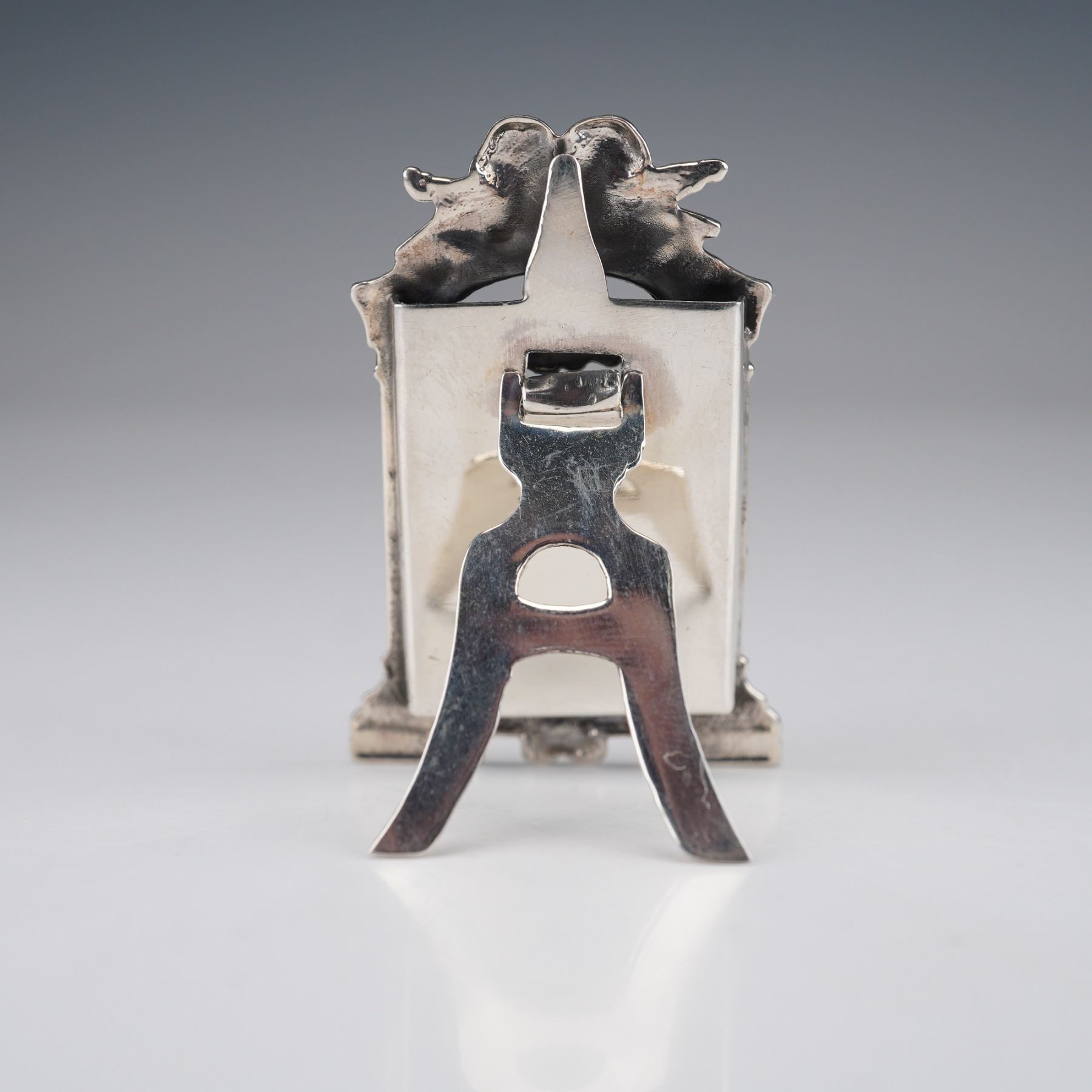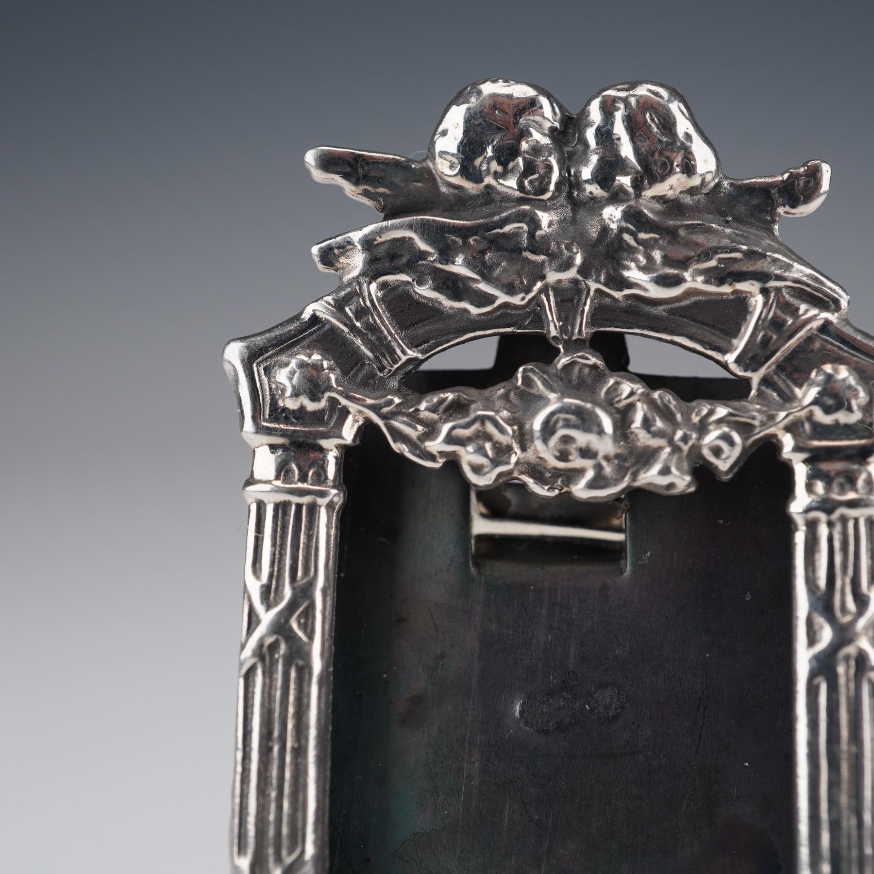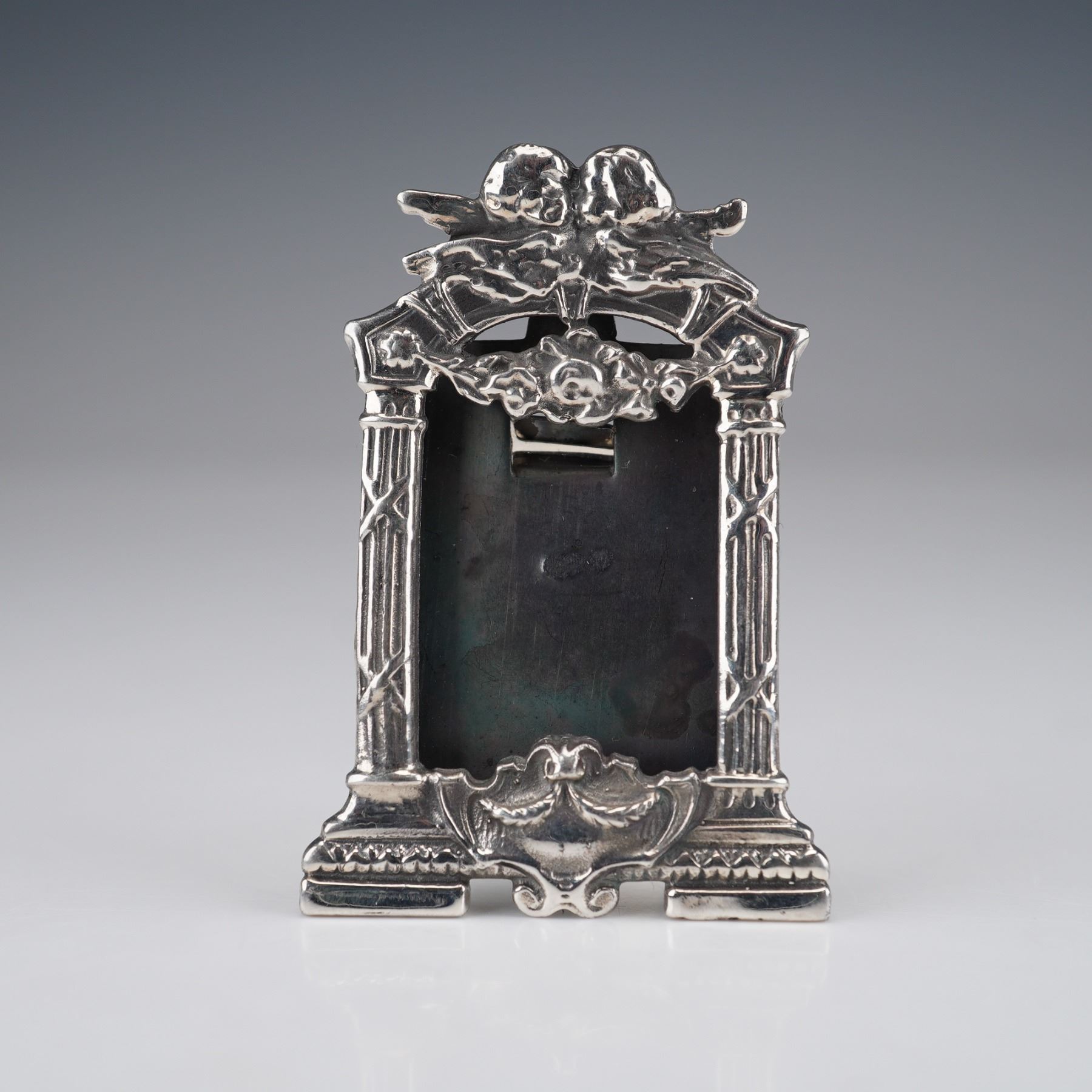 This sterling silver picture frame showcases a beautiful neoclassical design with cherubs positioned within the arch. The frame is adorned with intricately detailed columns and floral motifs, adding an elegant touch. The cherubs are situated at the top of the arch, enhancing the frame's romantic and classical charm. Marked "925" to indicate its sterling silver composition. Overall weight 0.37 oz.