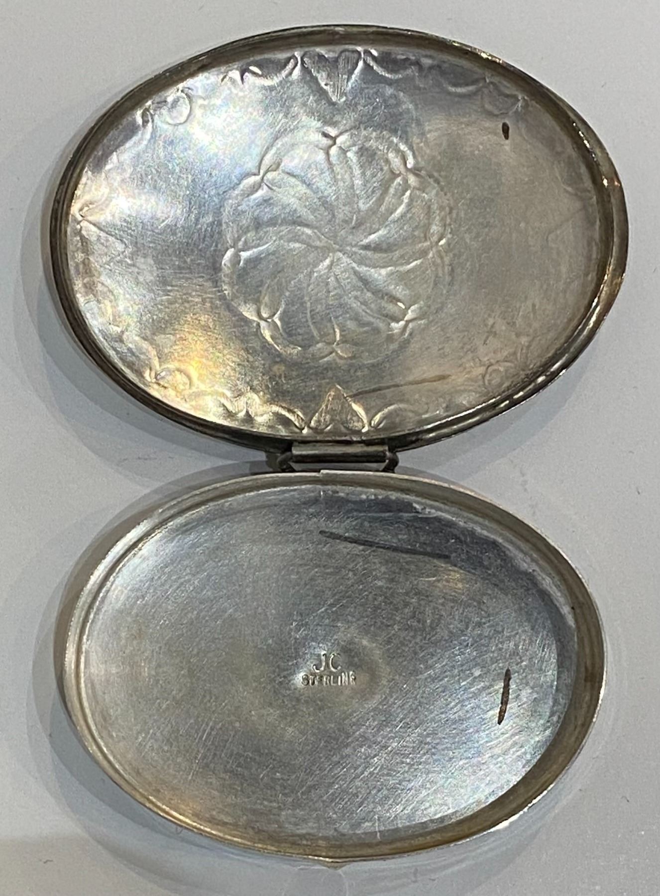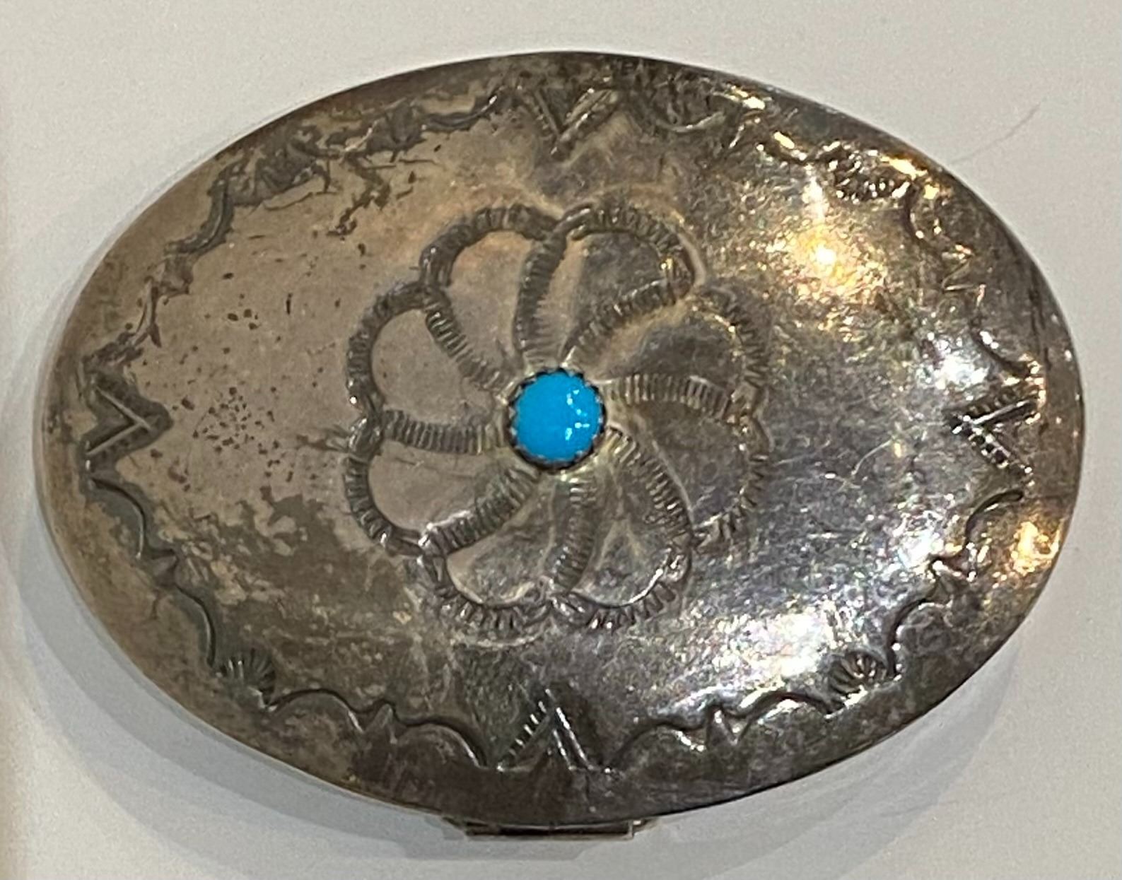 Sterling Silver Pill Box with turquoise stone and engraving work. Nicely done and stamped JC, 22 grams