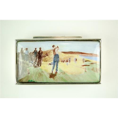 This Sterling Silver Pillbox would be an ideal gift for someone who plays golf. It is a Solid STERLING SILVER rectangular pillbox with a lovely painted scene of golfer. The box measures 2" x 1" and is in pristine condition.