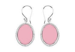 Perfect matching pair of prong-set oval shape pink chalcedony earrings with cabochon-cut are surrounded by small silver beads along with four round white CZs sparkling in between silver beads. These beautiful earrings are made in .925 sterling silver rhodium & have a total weight (TGW) of 30.00 carats and comes with comfortable and stylish french wire. It also available matching ring model no. LRBK70244AGCZCPK and Pendant model no. PDBK70344AGCZCPK.