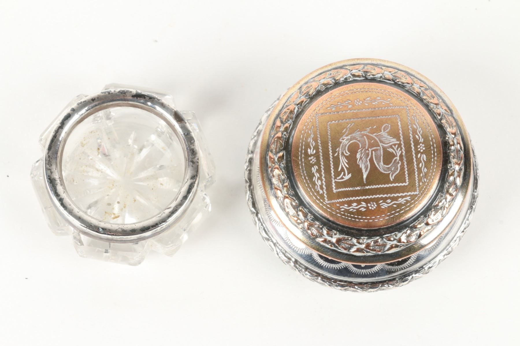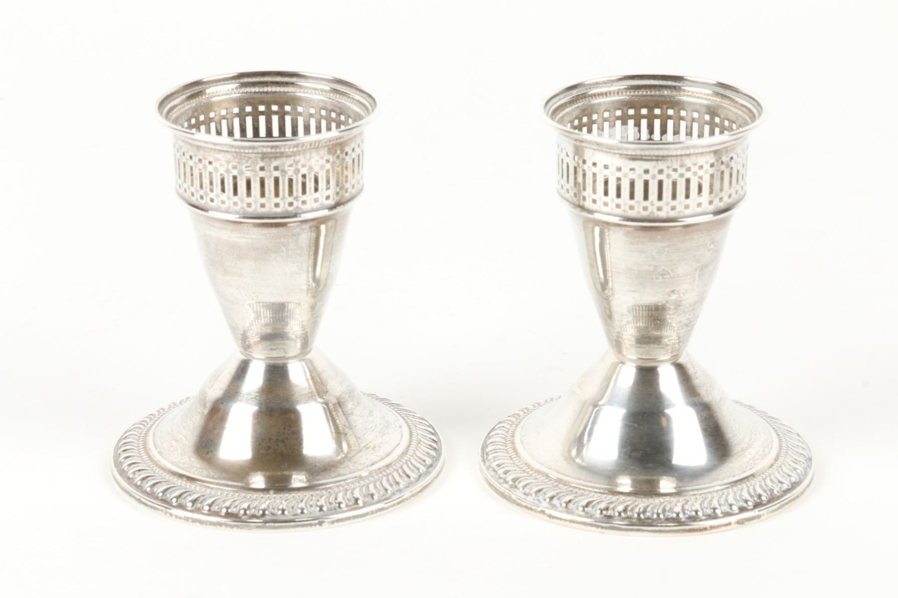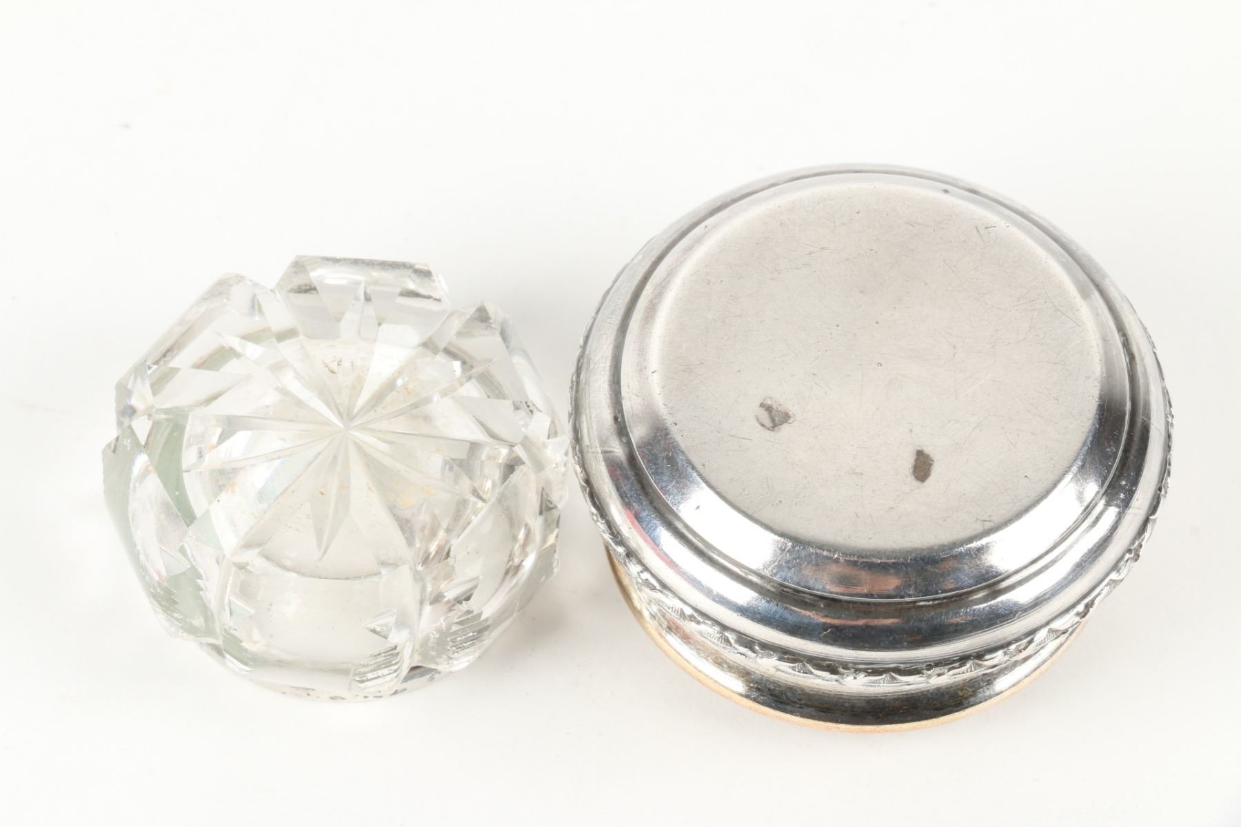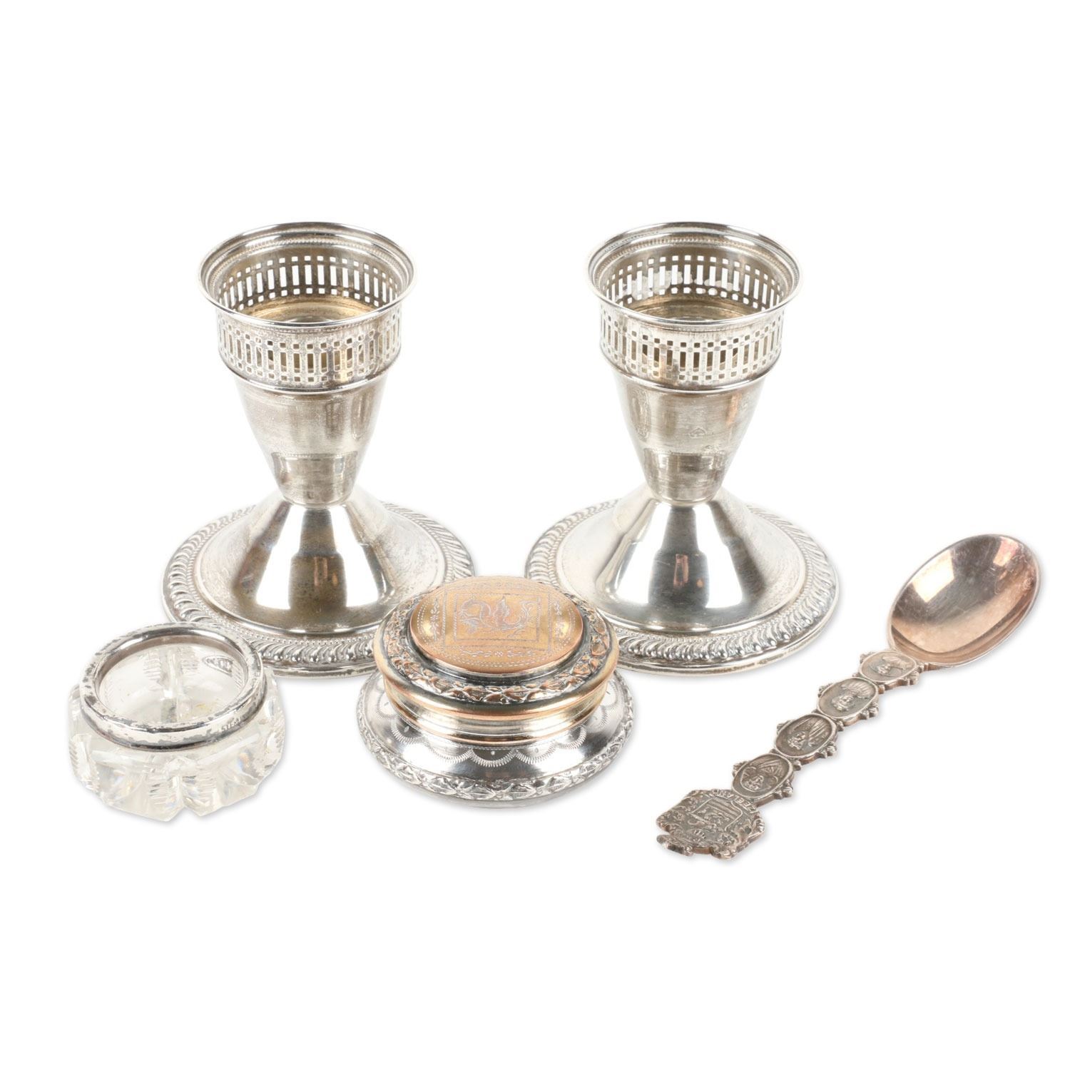 Lot 467 - Pair (2) weighted sterling candlesticks. Zeeland souvenir spoon, cut glass cellar and plated compact. Candlesticks 3.25” h. $100-200.