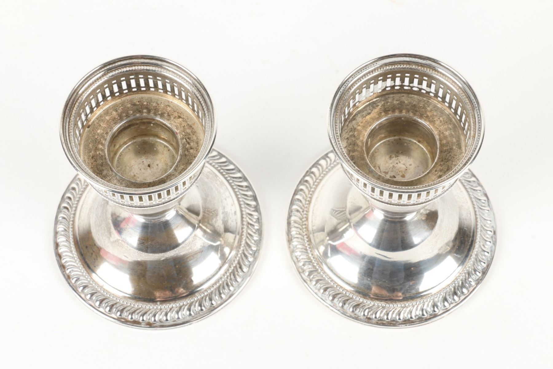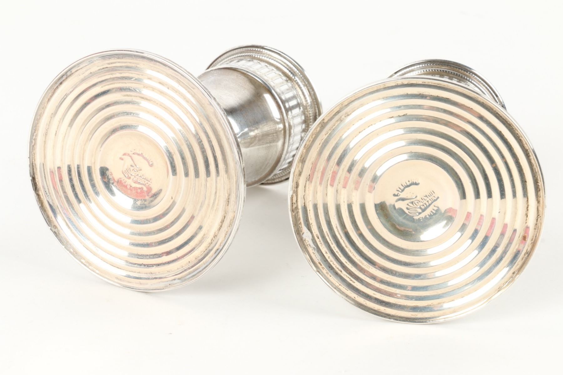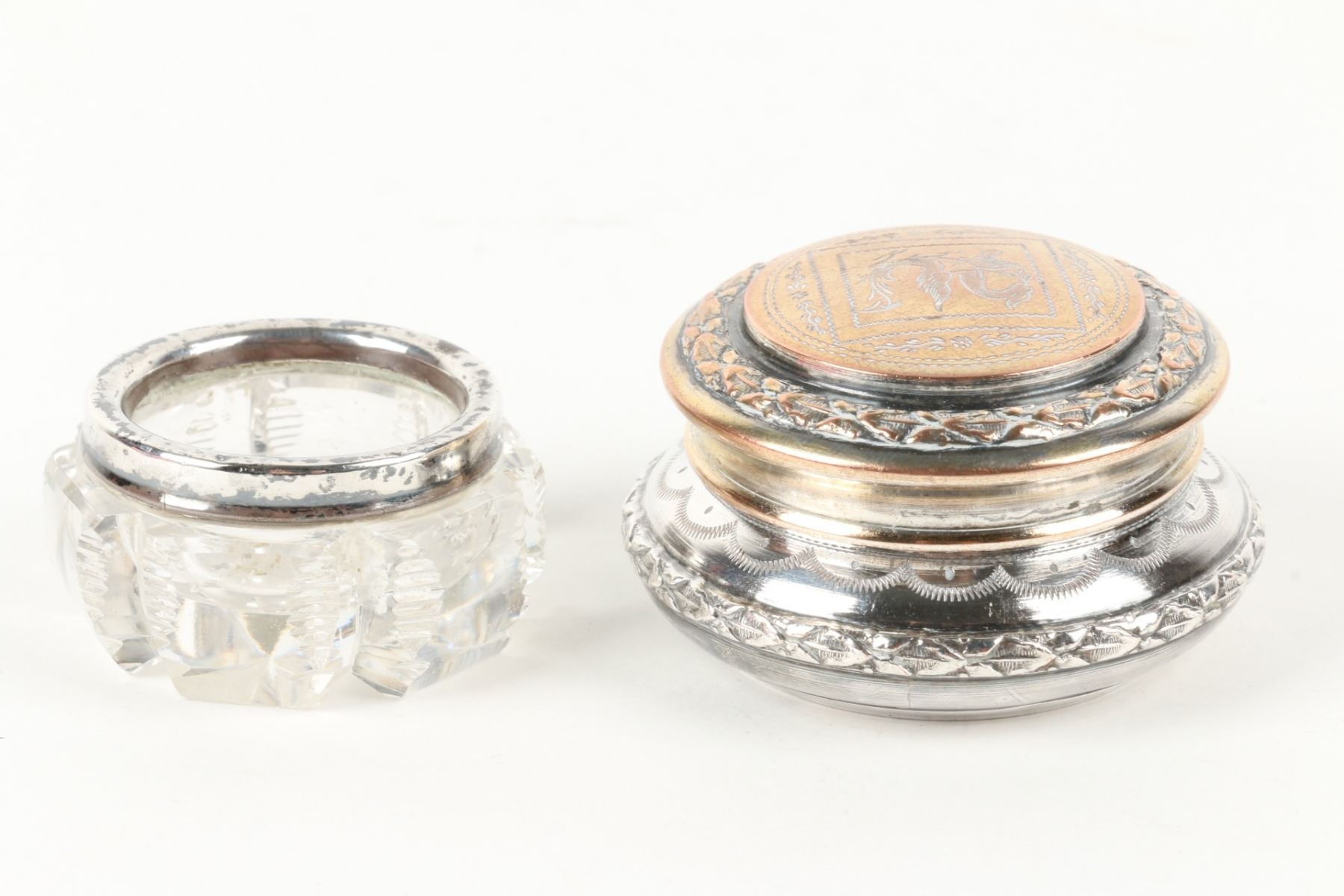 Lot 467 - Pair (2) weighted sterling candlesticks. Zeeland souvenir spoon, cut glass cellar and plated compact. Candlesticks 3.25” h. $100-200.