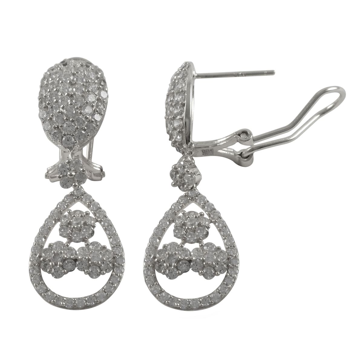 Sterling Silver Post Clip Earrings, Teardrop With Flowers, White CZ, 1.5"