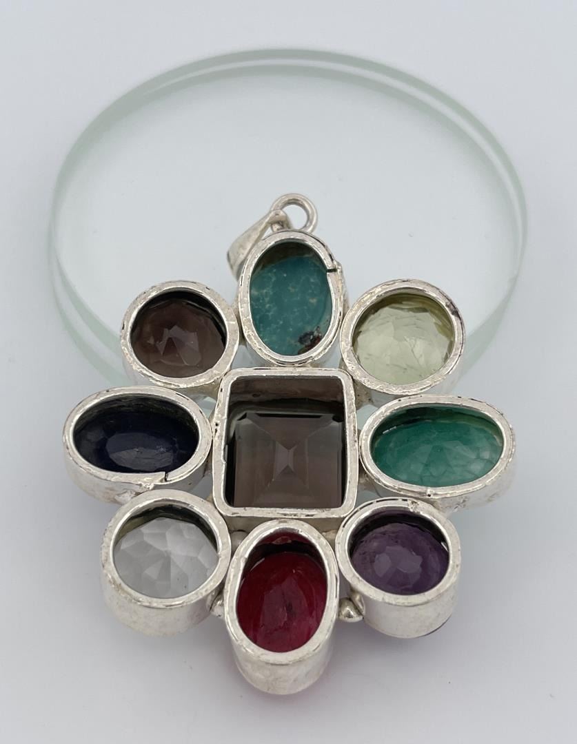 Very nice pendant. Set with an array of stones. 2" long.