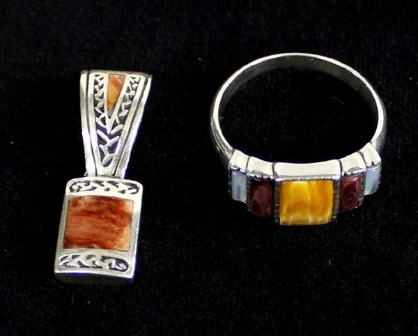 Sterling Silver Red Shell Pendant and Ring, 10.25, both are stamped .925 and ring is hallmarked WJ, pendant measures 1.25''L and ring is 3/8''W