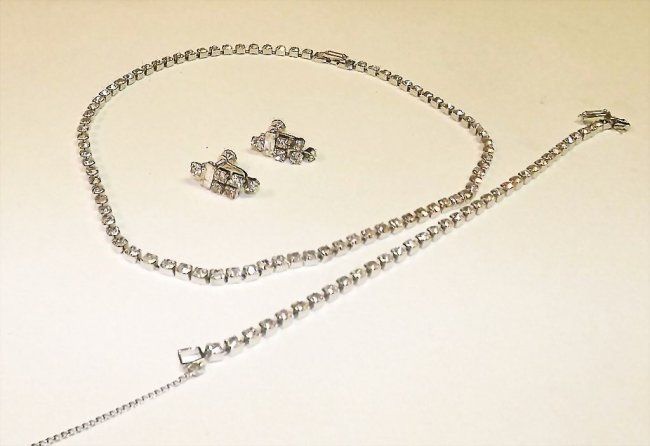 What an elegant beauty! For your consideration is this outstanding and very elegant sterling silver and rhinestones demi parure. The set includes a choker necklace, screw back type earrings, and a bracelet with a safety chain. All rhinestones are round cut, exquisite and sparkly, with no yellowing or darkening. All pieces are marked "sterling". The choker measures about 15" long, the bracelet measure about 7" inside circumference, and the earrings are 3/4" long. Rare set! While rhinestone vintage set are fairly common, the ones made in sterling are quite rare. Wonderful opportunity to add this rare vintage beauty to your collection!