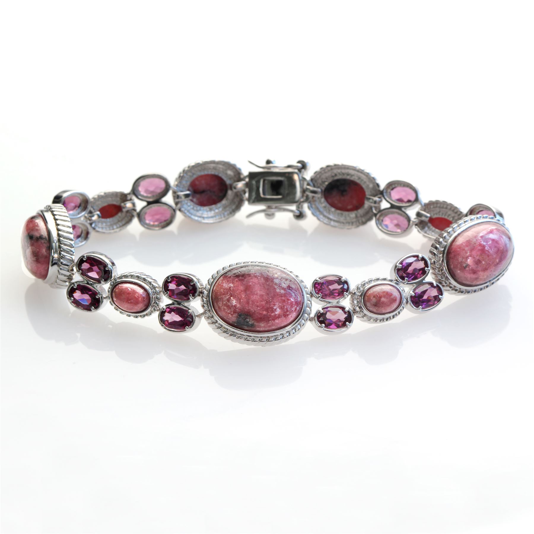 Pangea Mines Treasured Gems Collection Genuine sparkling rhodolite garnet & rhodonite gemstones adorn this lovely design from the Pangea Mines Treasured Gems Collection. Crafted in gleaming rhodium over sterling silver with a convenient, secure slide insert clasp, this smart design will beautifully complement your wardrobe.