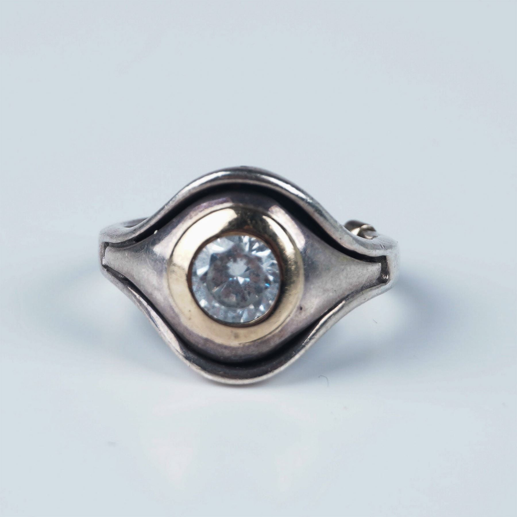 A contemporary sterling silver ring marked 925, featuring a bezel-set cubic zirconia stone accentuated by a gold-toned bezel and an elegant wave-like design. The ring is approximately size 6, with a total weight of 8 grams. The piece showcases a stylish and versatile design suitable for everyday wear or special occasions.