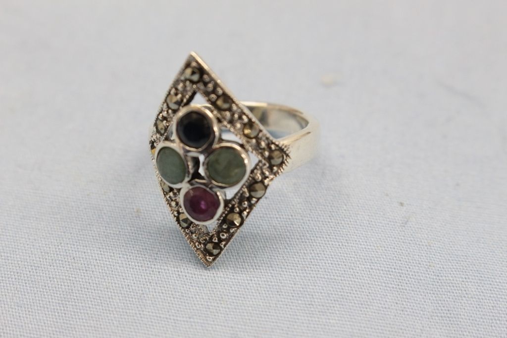 Sterling Silver Ring With Genuine Rough Cut Emeralds, Ruby and Sapphire Surrounded by Marcasite (size 6.5)