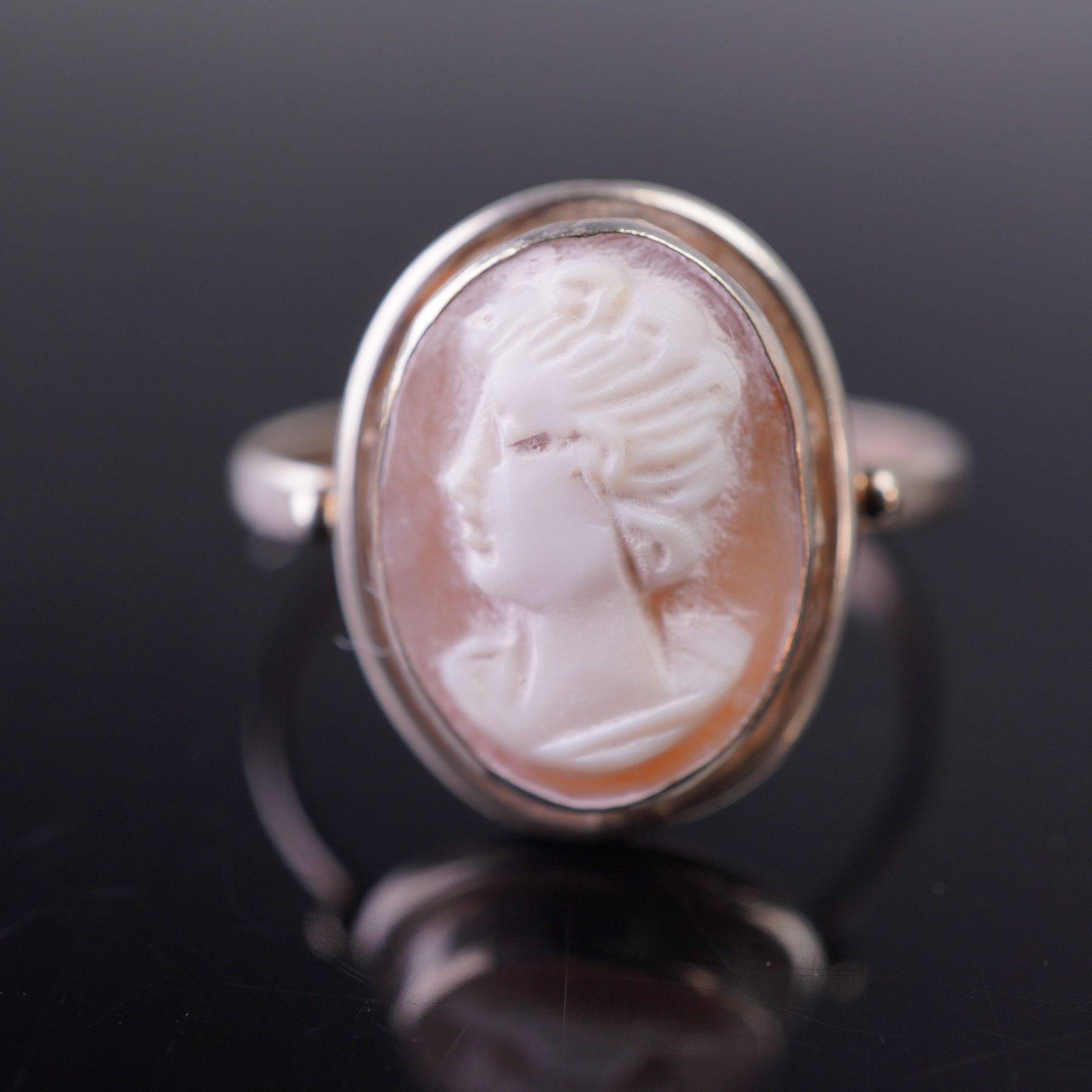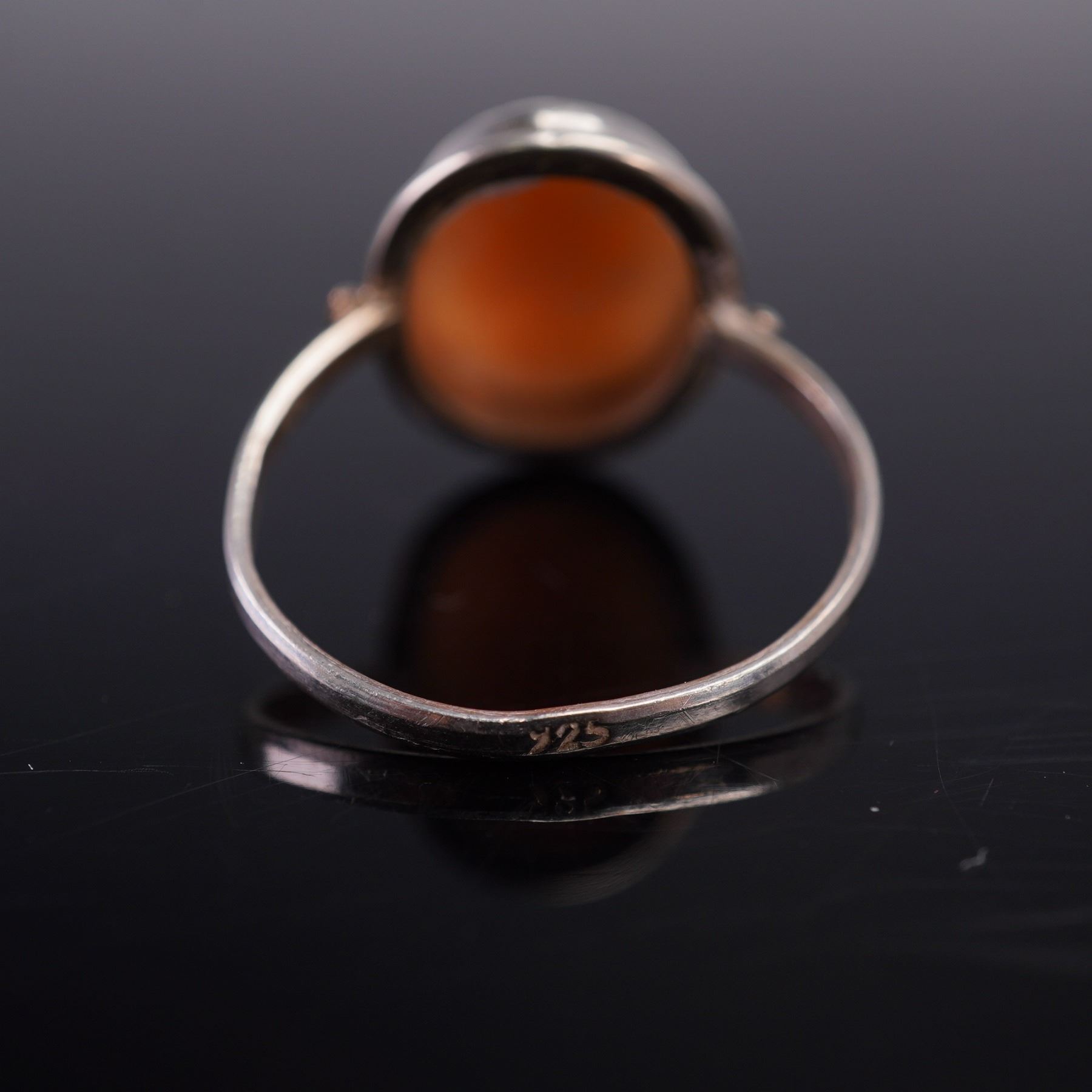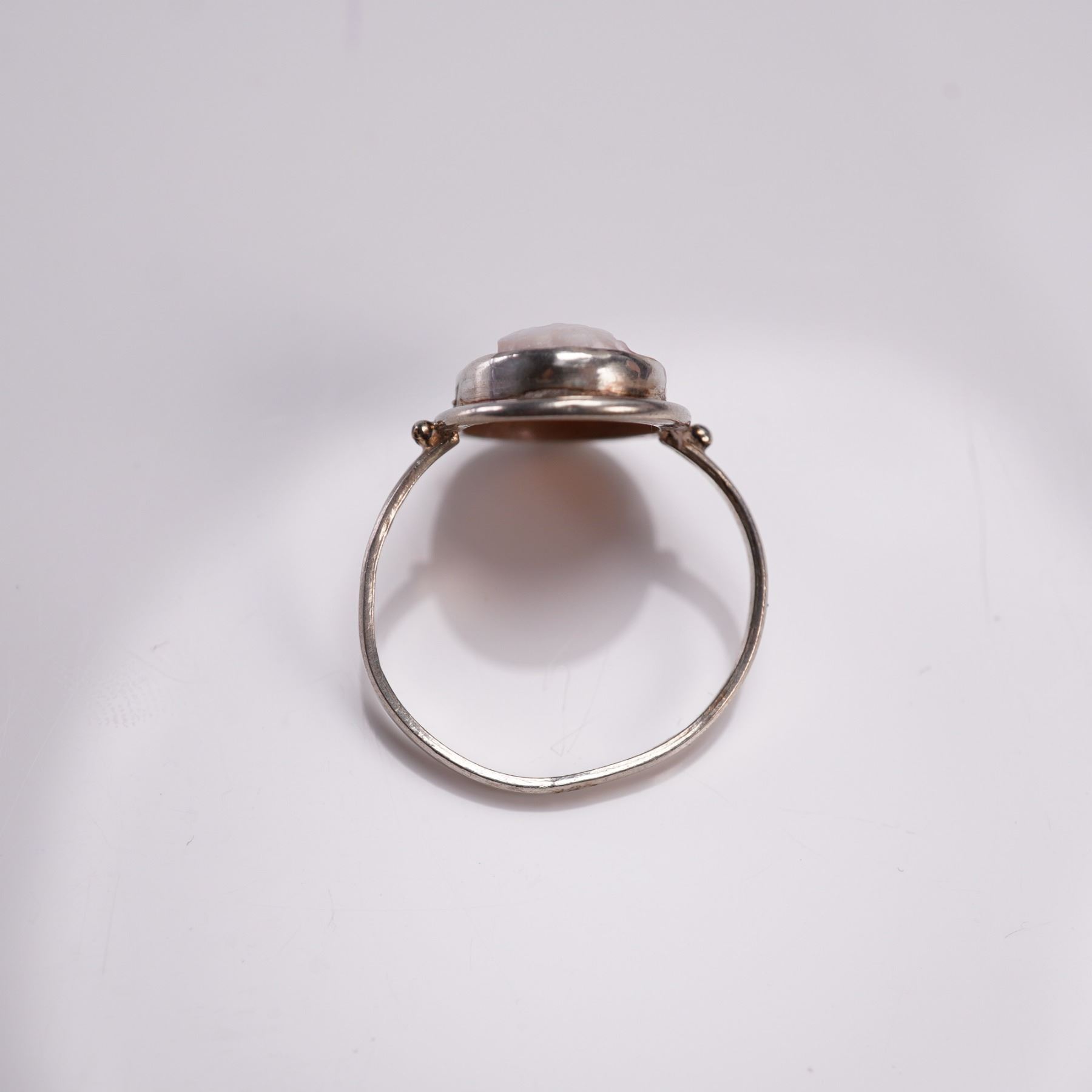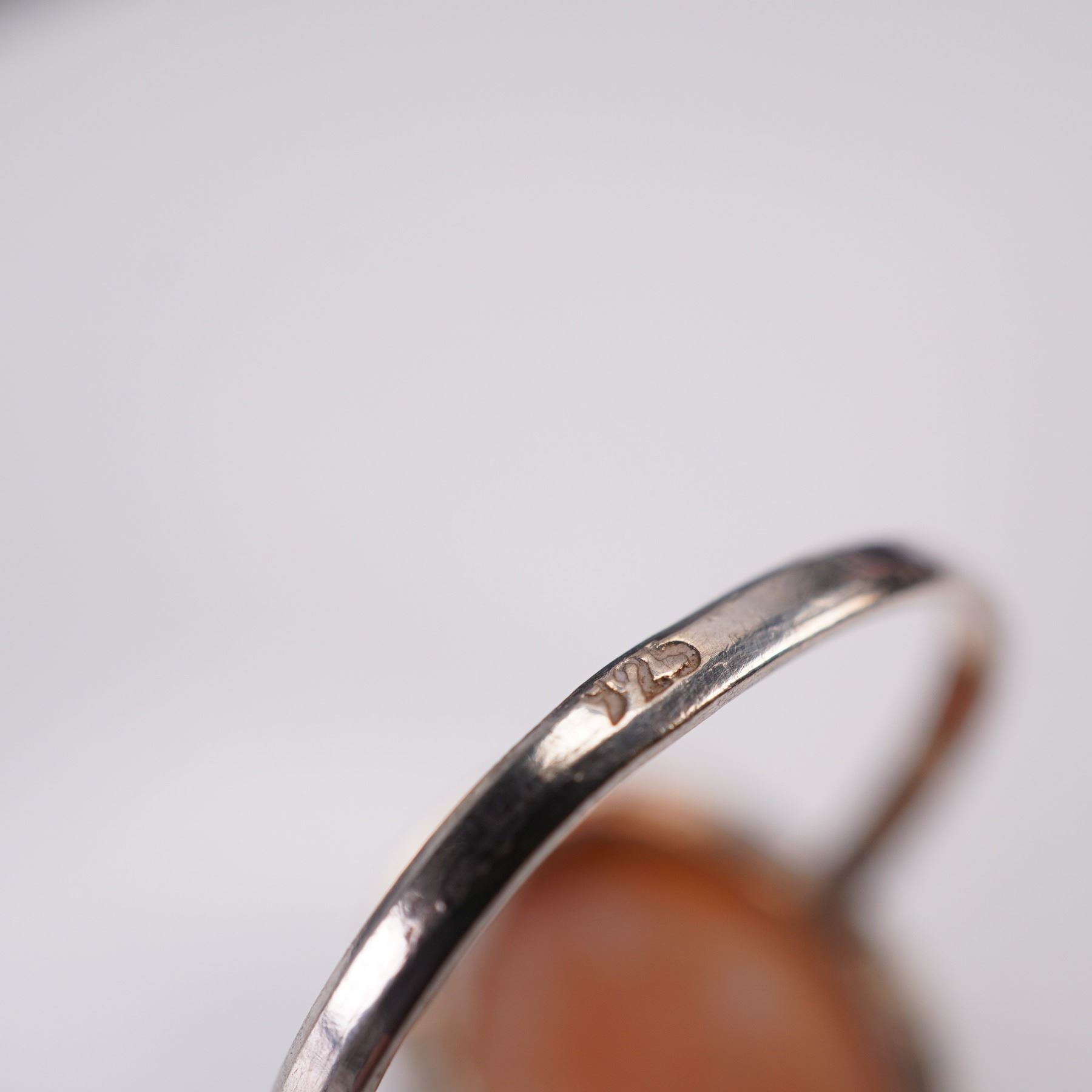 Sterling silver ring featuring an oval carved shell cameo with a classic profile portrait in white against a peach-toned ground. The setting is simple and elegant with a raised bezel frame and narrow band marked 925 on the band. A timeless design inspired by vintage and neoclassical styles, ideal for collectors or daily wear. Total weight with cameo is 2 grams. Approximately size 7.