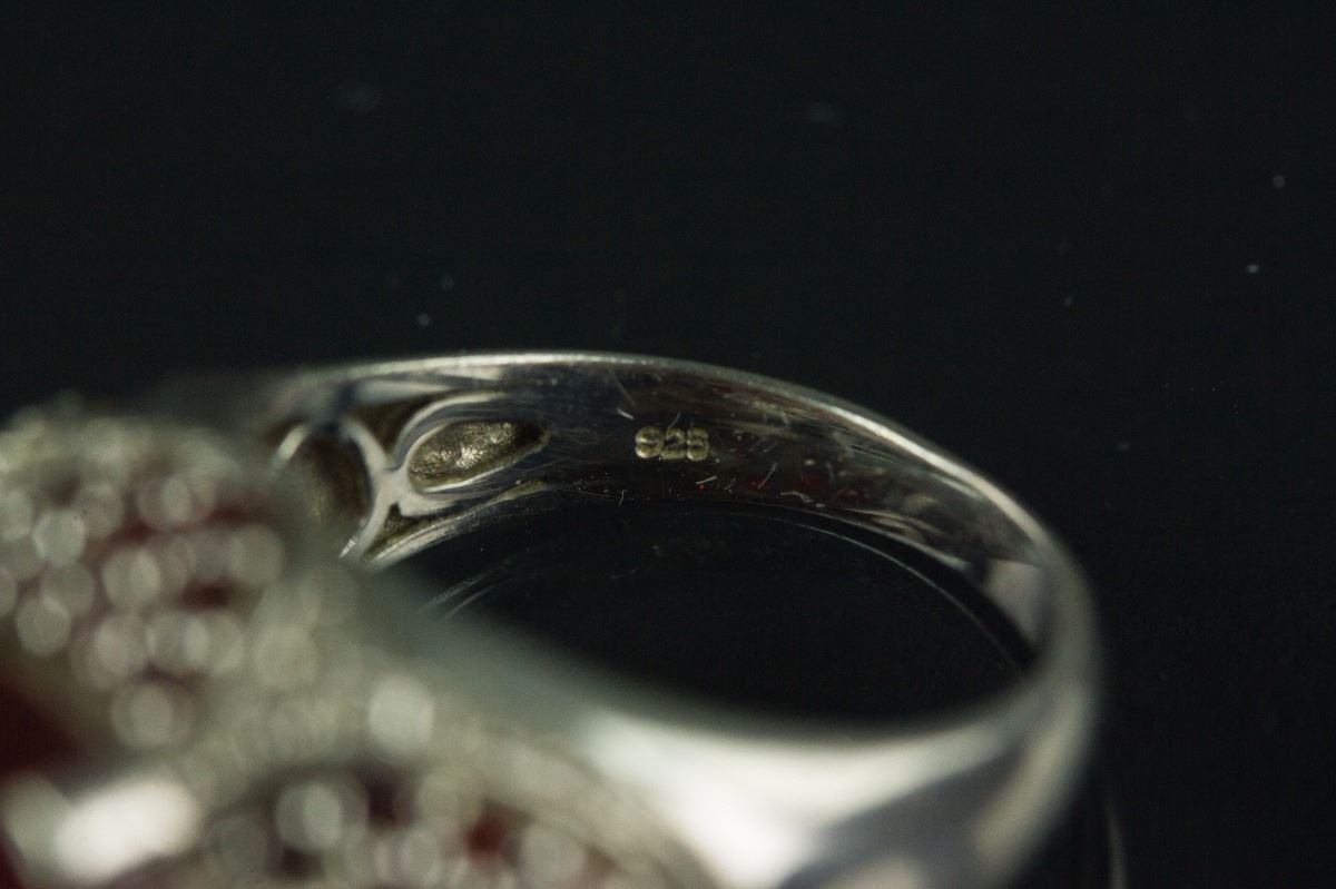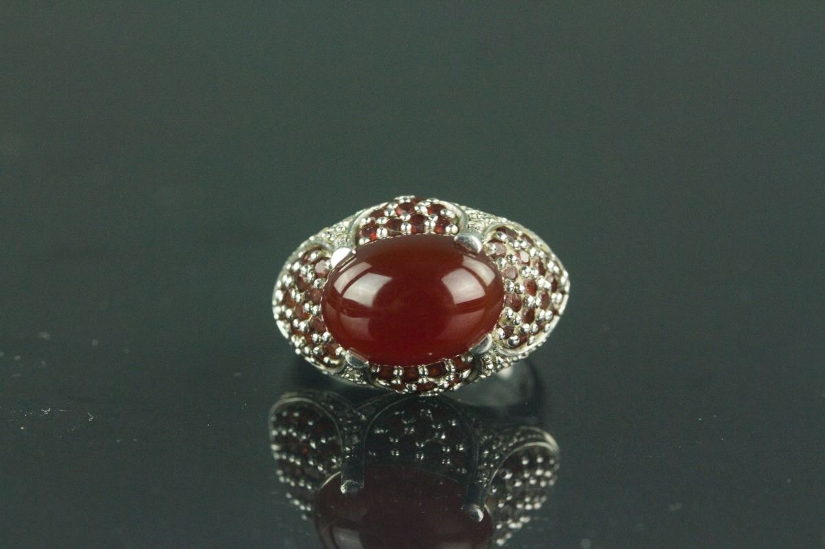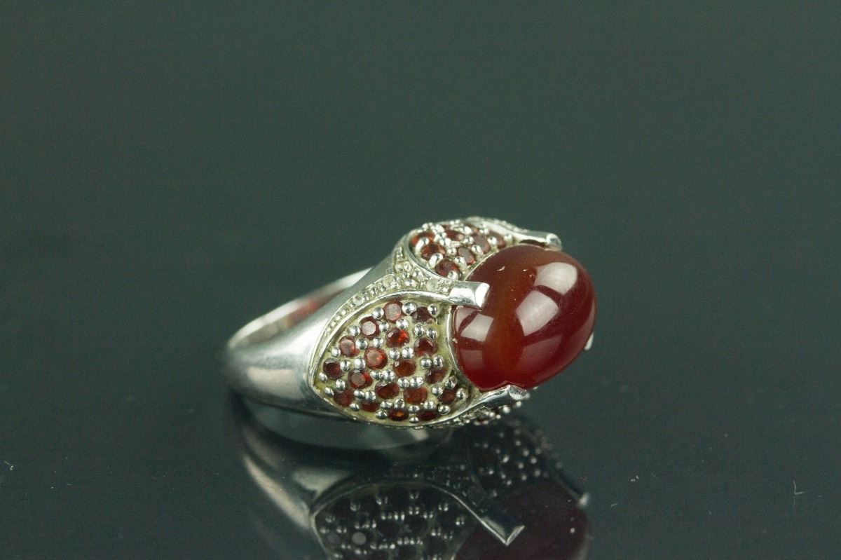 Fine sterling silver ring; inlaid with an amber cabochon surrounded by 54 garnets; stamped with 925 silver mark inside ring; 7 grams, 8 grams