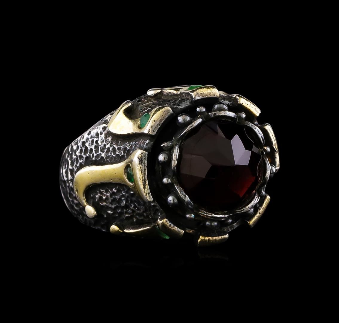 One of a kind high fashion sterling silver Ring weighing 13 grams. Black Antique texture. Containing: Tourmaline, Emerald. This sterling silver promises a lasting shine.