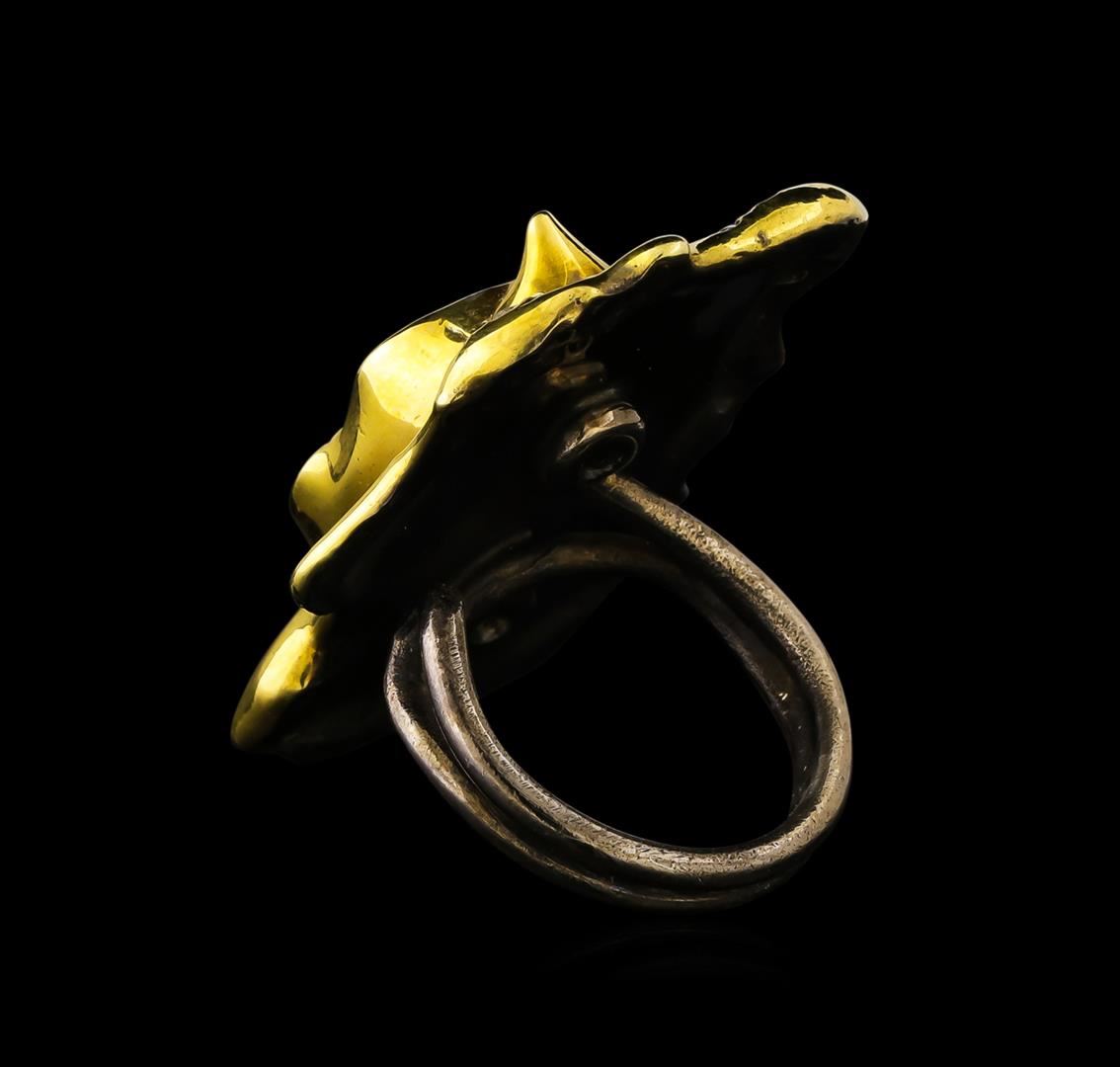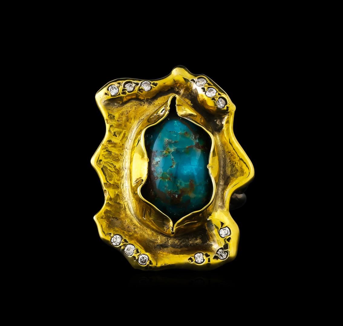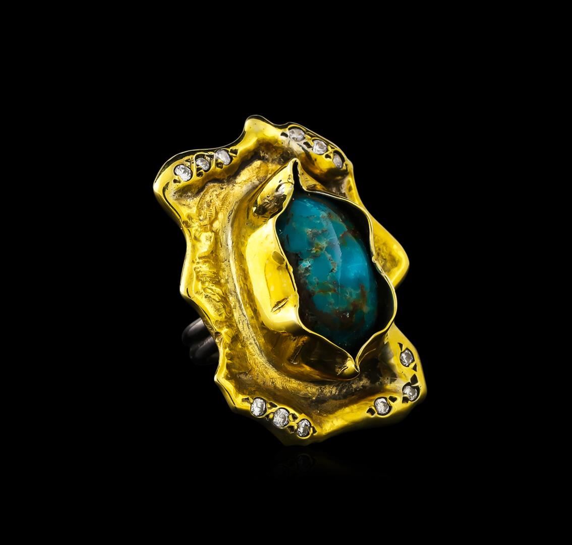 One of a kind high fashion sterling silver Ring weighing 13.6 grams. Black Antique texture. Containing: Created Turquoise, White Crystal. This sterling silver promises a lasting shine.