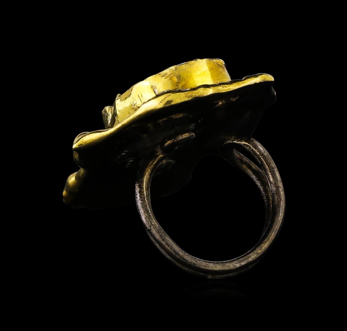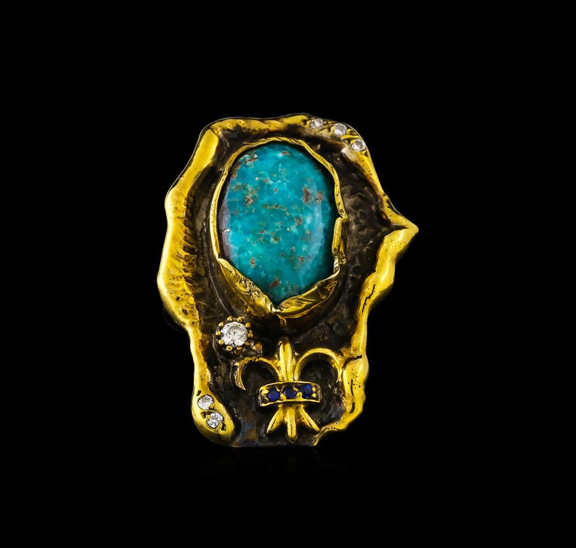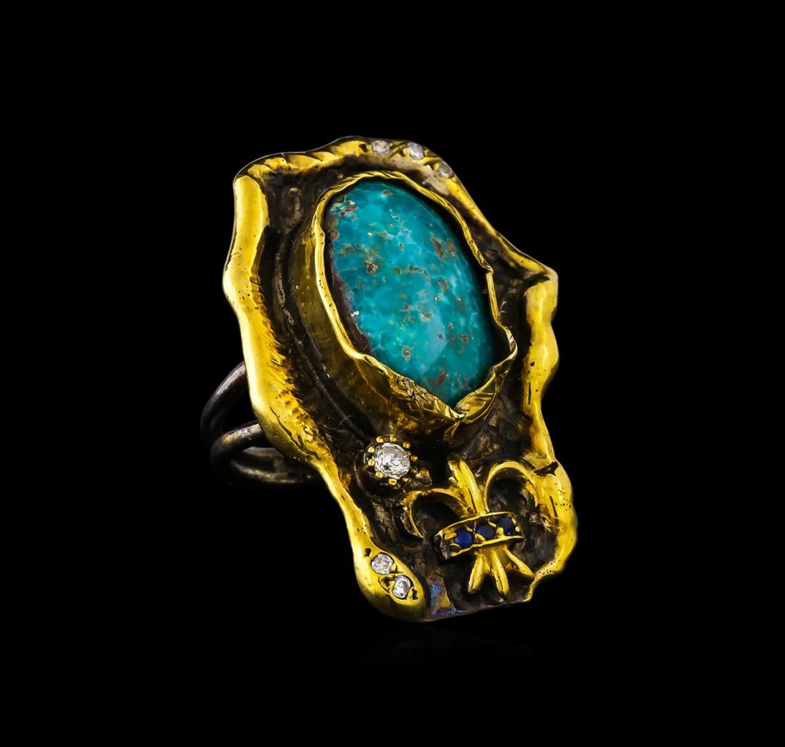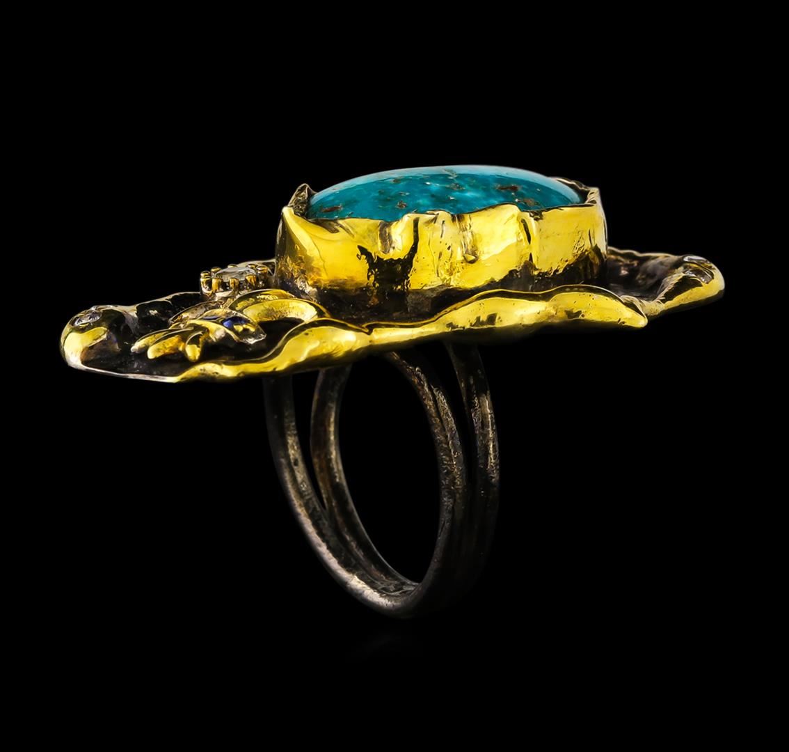 One of a kind high fashion sterling silver Ring weighing 16.2 grams. Black Antique texture. Containing: Turquoise, White Crystal, Blue Crystal. This sterling silver promises a lasting shine.