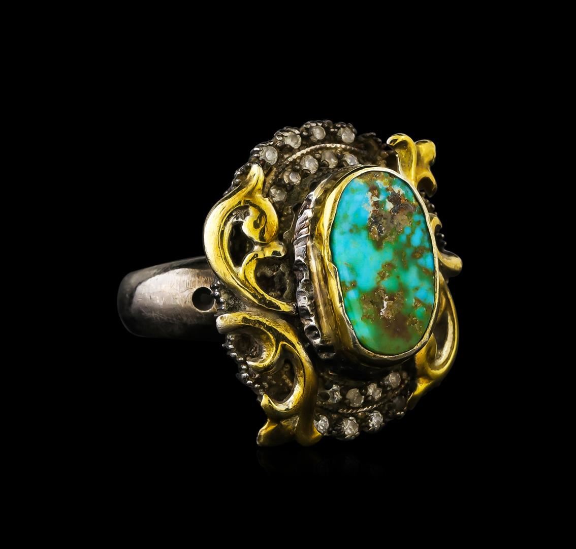 One of a kind high fashion sterling silver Ring weighing 15.9 grams. Black Antique texture. Containing: Turquoise, White Crystal. This sterling silver promises a lasting shine.