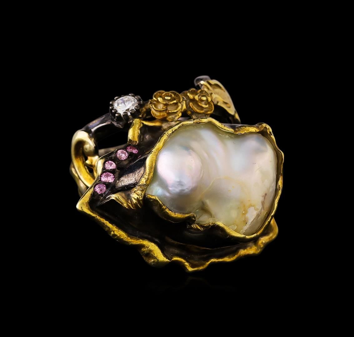 One of a kind high fashion sterling silver Ring weighing 25.7 grams. Black Antique texture. Containing: Freshwater Pearl, White Crystal, Pink Crystal. This sterling silver promises a lasting shine.
