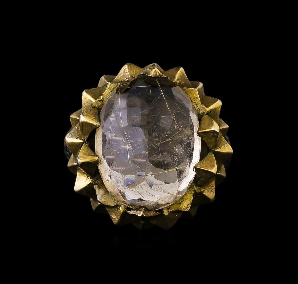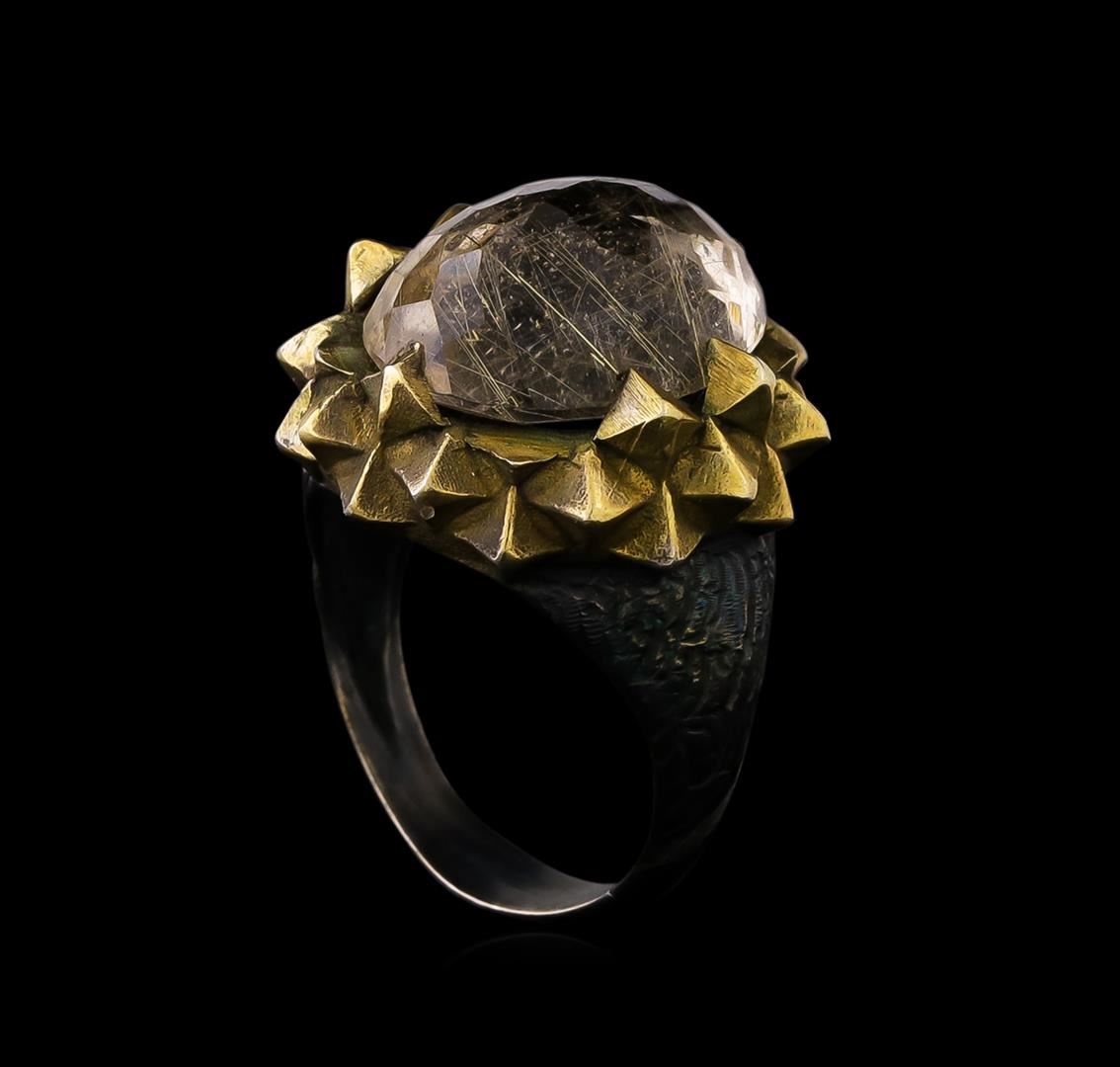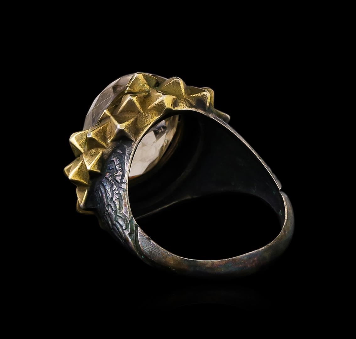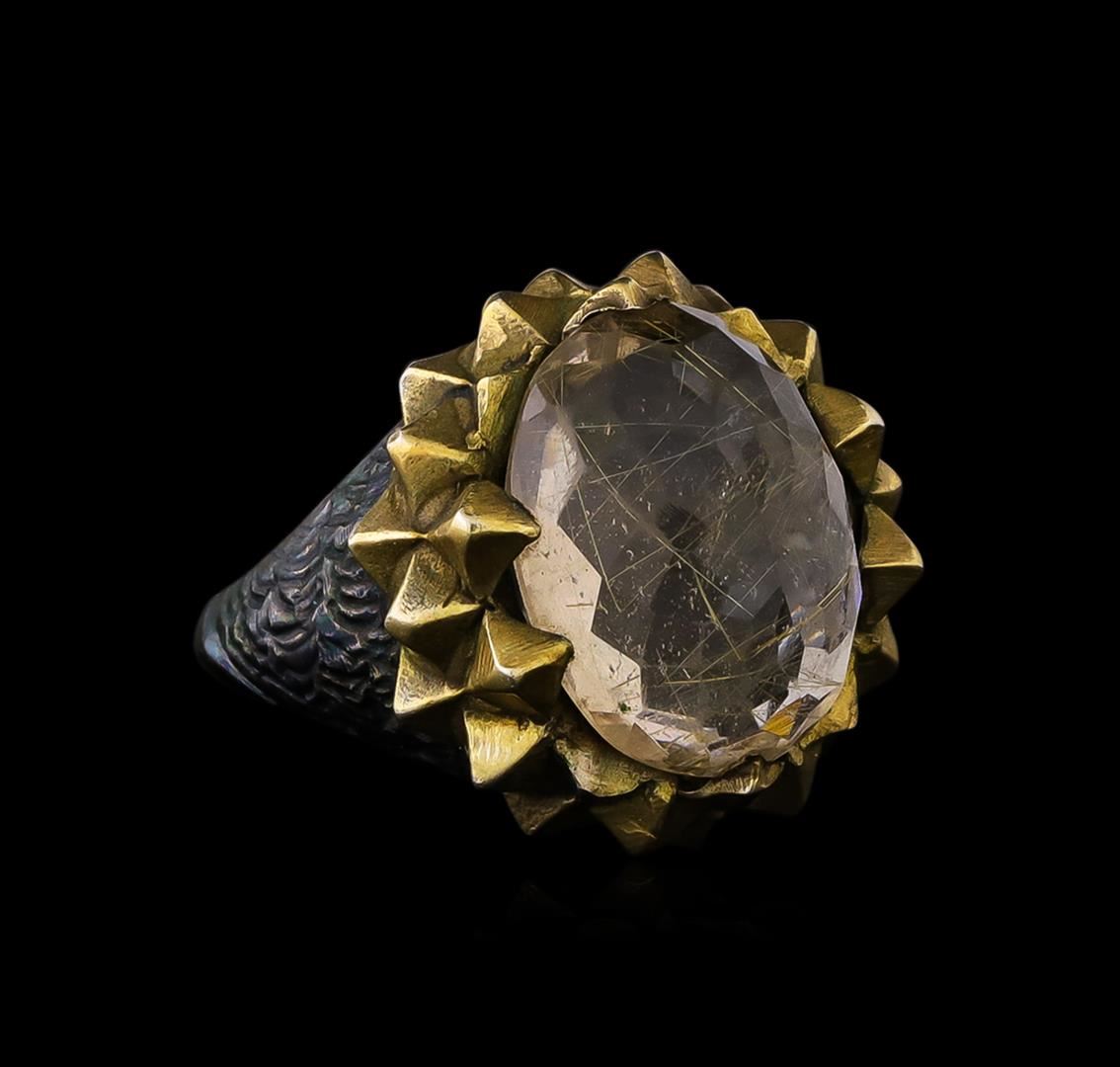 One of a kind high fashion sterling silver Ring weighing 8.9 grams. Black Antique texture. Containing: Rutilated Quartz. This sterling silver promises a lasting shine.