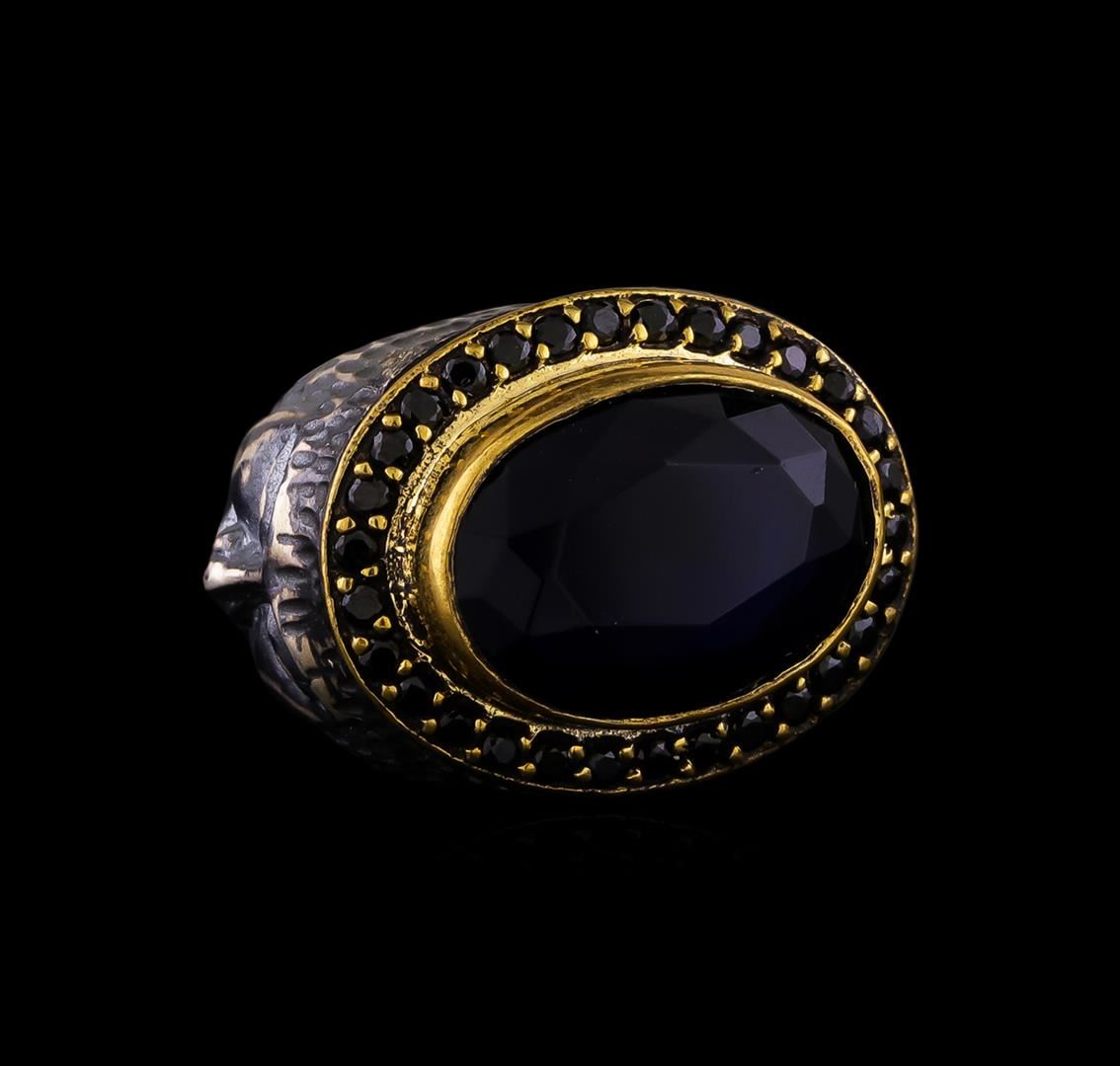 One of a kind high fashion sterling silver Ring weighing 12 grams. Black Antique texture. Containing: Blue Crystal, Black Crystal. This sterling silver promises a lasting shine.