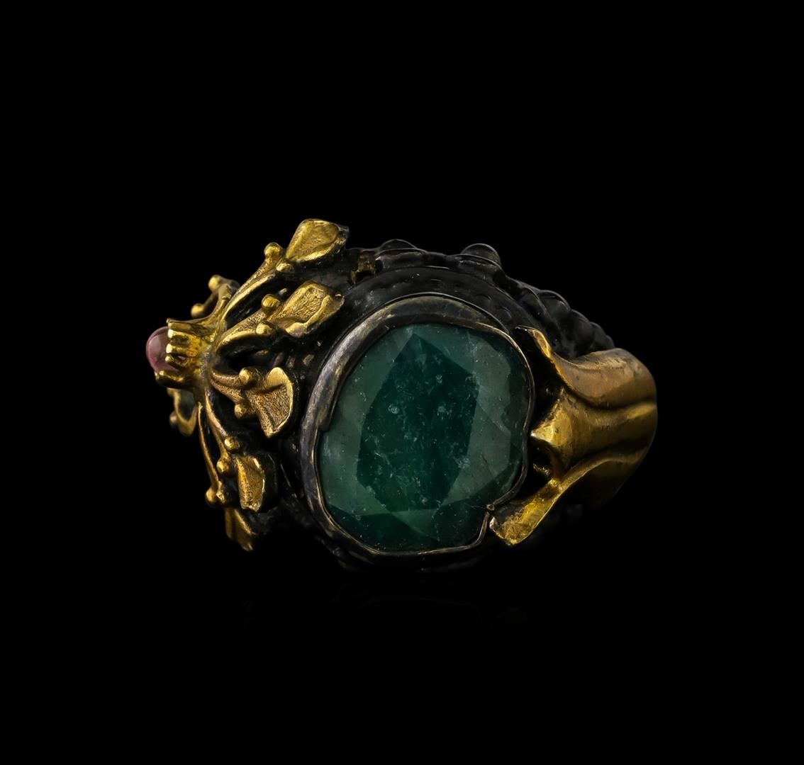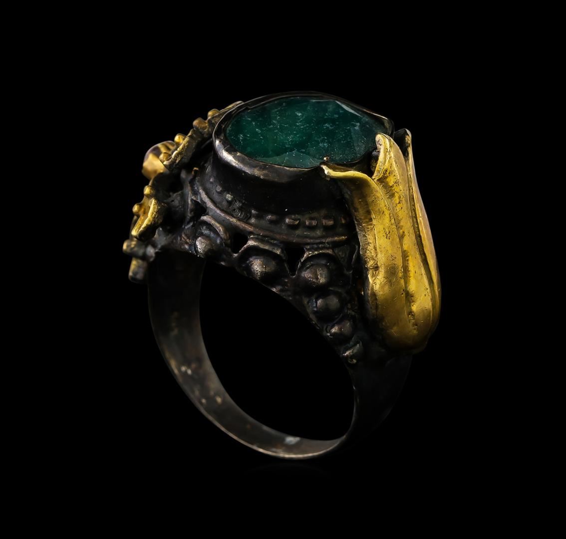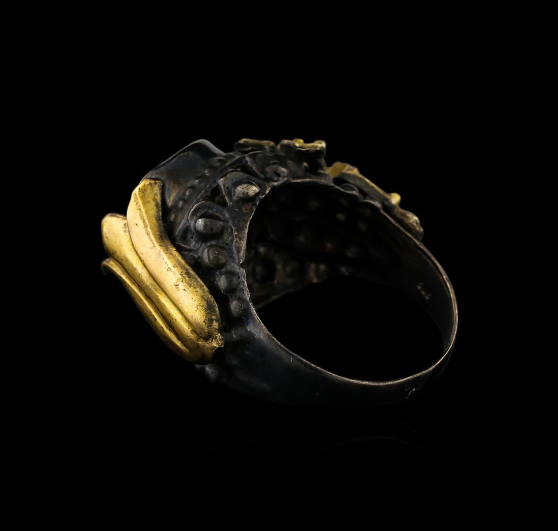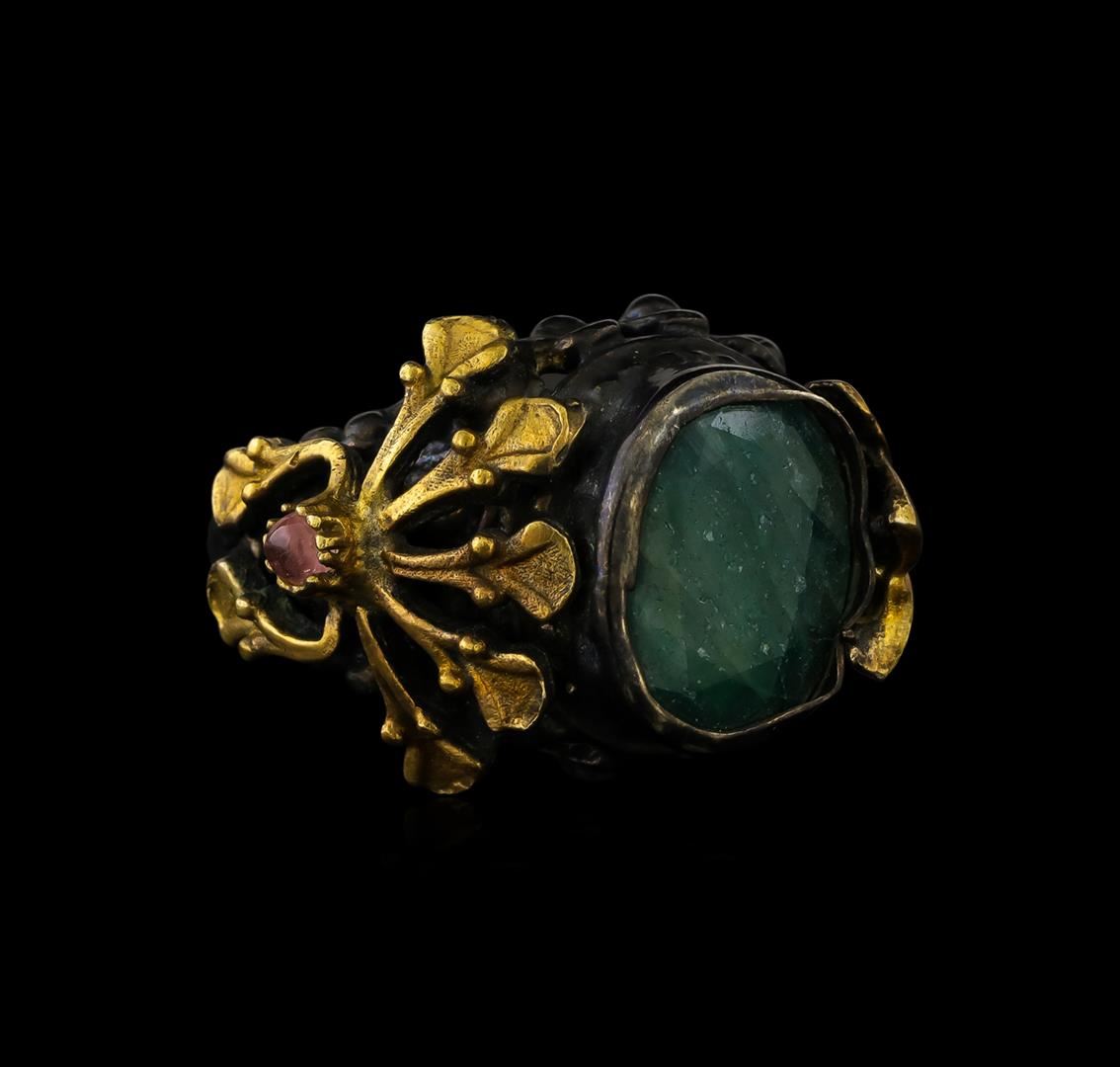 One of a kind high fashion sterling silver Ring weighing 13.8 grams. Black Antique texture. Containing: Green Corundum, Quartz. This sterling silver promises a lasting shine.