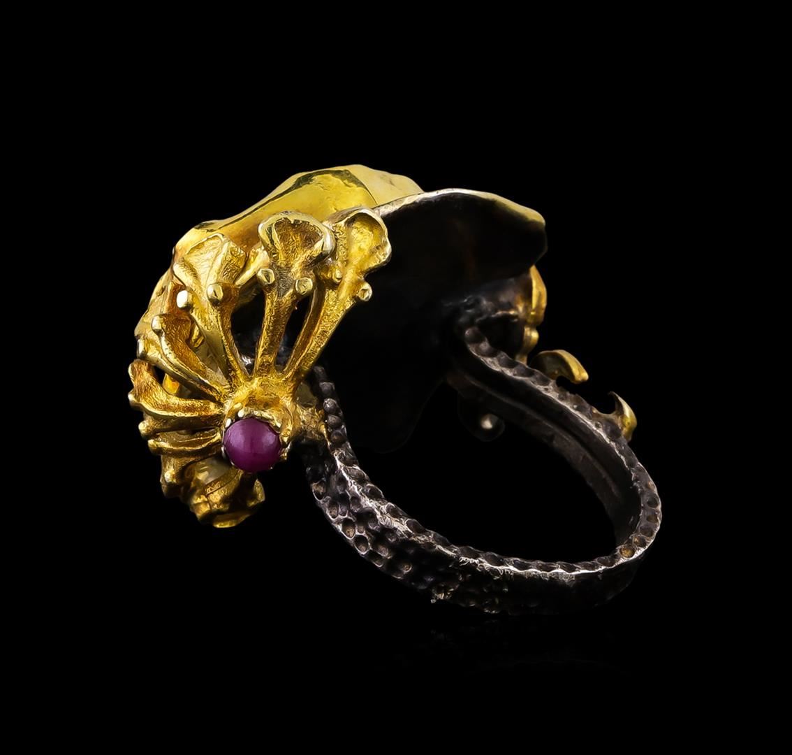 One of a kind high fashion sterling silver Ring weighing 11.1 grams. Black Antique texture. Containing: Lemon Quartz, Ruby. This sterling silver promises a lasting shine.