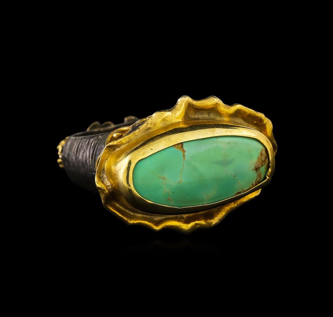 One of a kind high fashion sterling silver Ring weighing 20.9 grams. Black Antique texture. Containing: Turquoise, Peridot, White Crystal. This sterling silver promises a lasting shine.