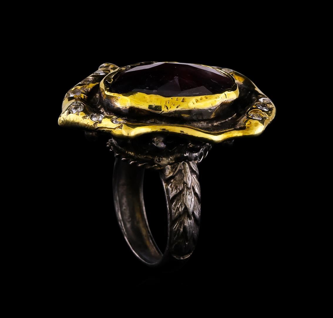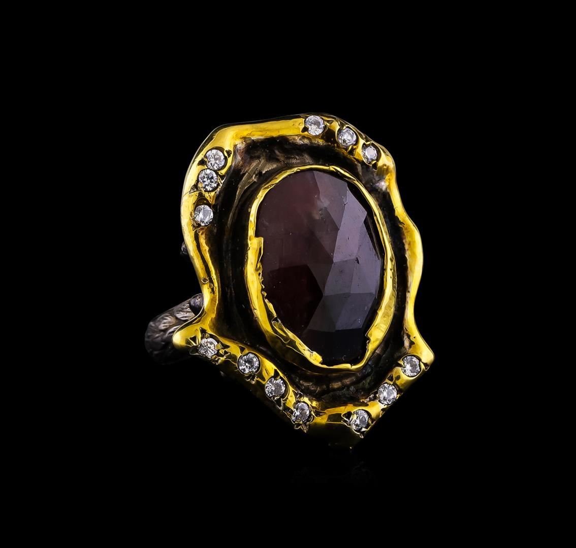 One of a kind high fashion sterling silver Ring weighing 17.7 grams. Black Antique texture. Containing: Ruby, White Crystal. This sterling silver promises a lasting shine.