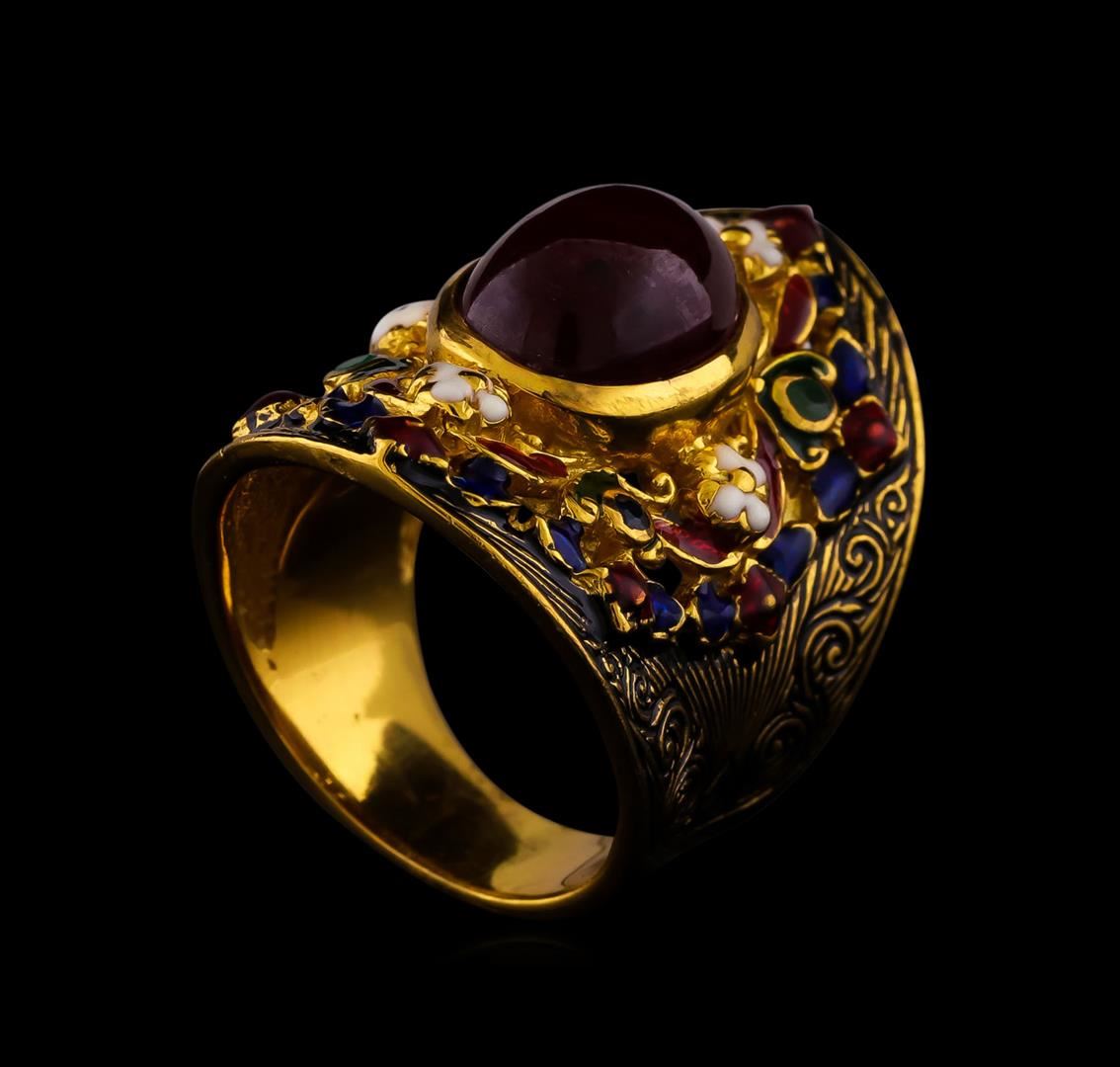 One of a kind high fashion sterling silver Ring weighing 20.2 grams. Containing: Ruby, Multi-color Enamel Inlay. This sterling silver promises a lasting shine.