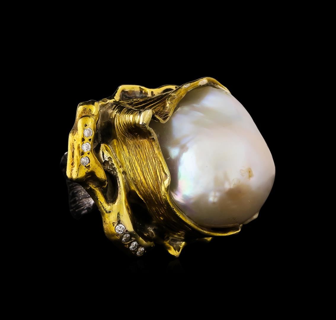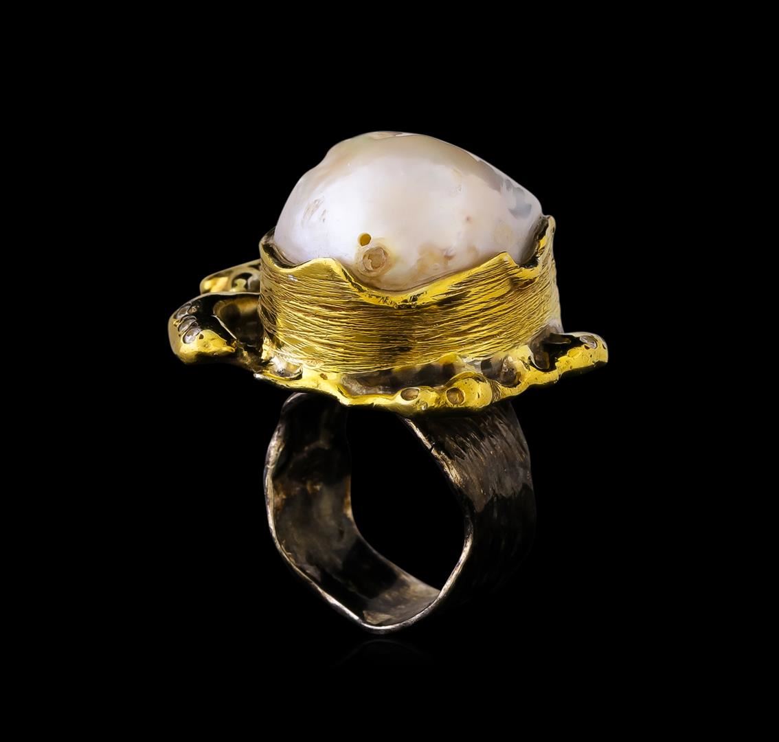 One of a kind high fashion sterling silver Ring weighing 25.5 grams. Black Antique texture. Containing: Freshwater Pearl, White Crystal. This sterling silver promises a lasting shine.