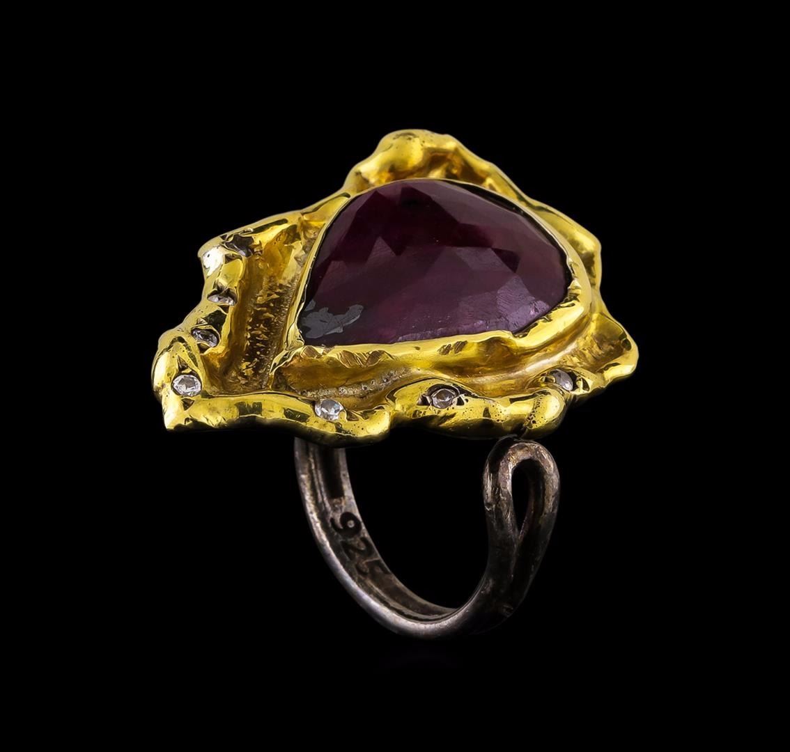One of a kind high fashion sterling silver Ring weighing 11 grams. Black Antique texture. Containing: Corundum, White Crystal. This sterling silver promises a lasting shine.