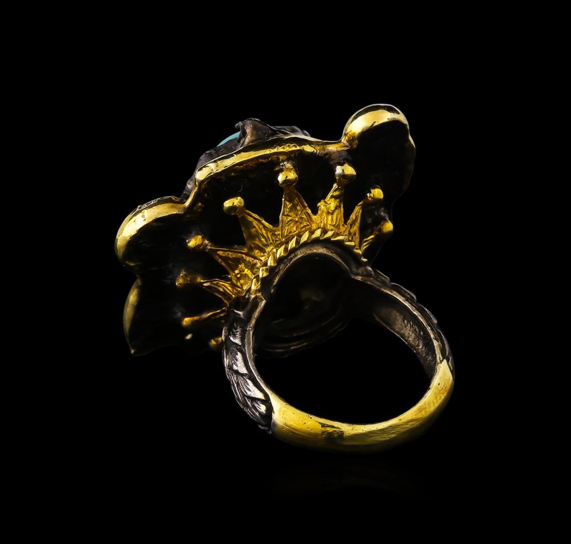 One of a kind high fashion sterling silver Ring weighing 18.8 grams. Black Antique texture. Containing: Created Turquoise, White Crystal. This sterling silver promises a lasting shine.