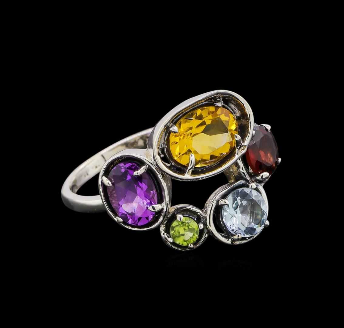 One of a kind high fashion sterling silver Ring weighing 4.1 grams. Containing: Citrine, Amethyst, Blue Topaz, Tourmaline, Peridot. This sterling silver promises a lasting shine.