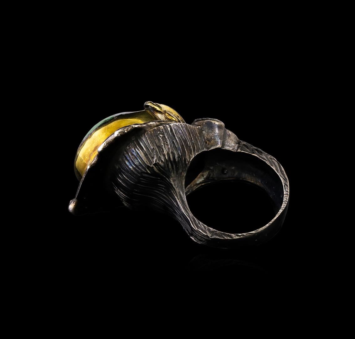 One of a kind high fashion sterling silver Ring weighing 32.2 grams. Black Antique texture. Containing: Created Green Agate, White Crystal, Black Crystal. This sterling silver promises a lasting shine.