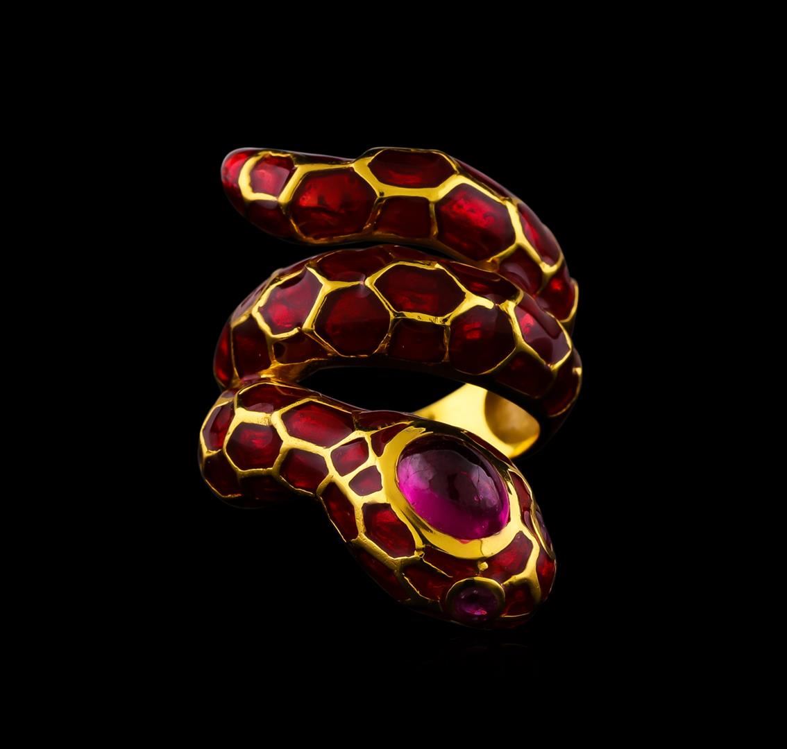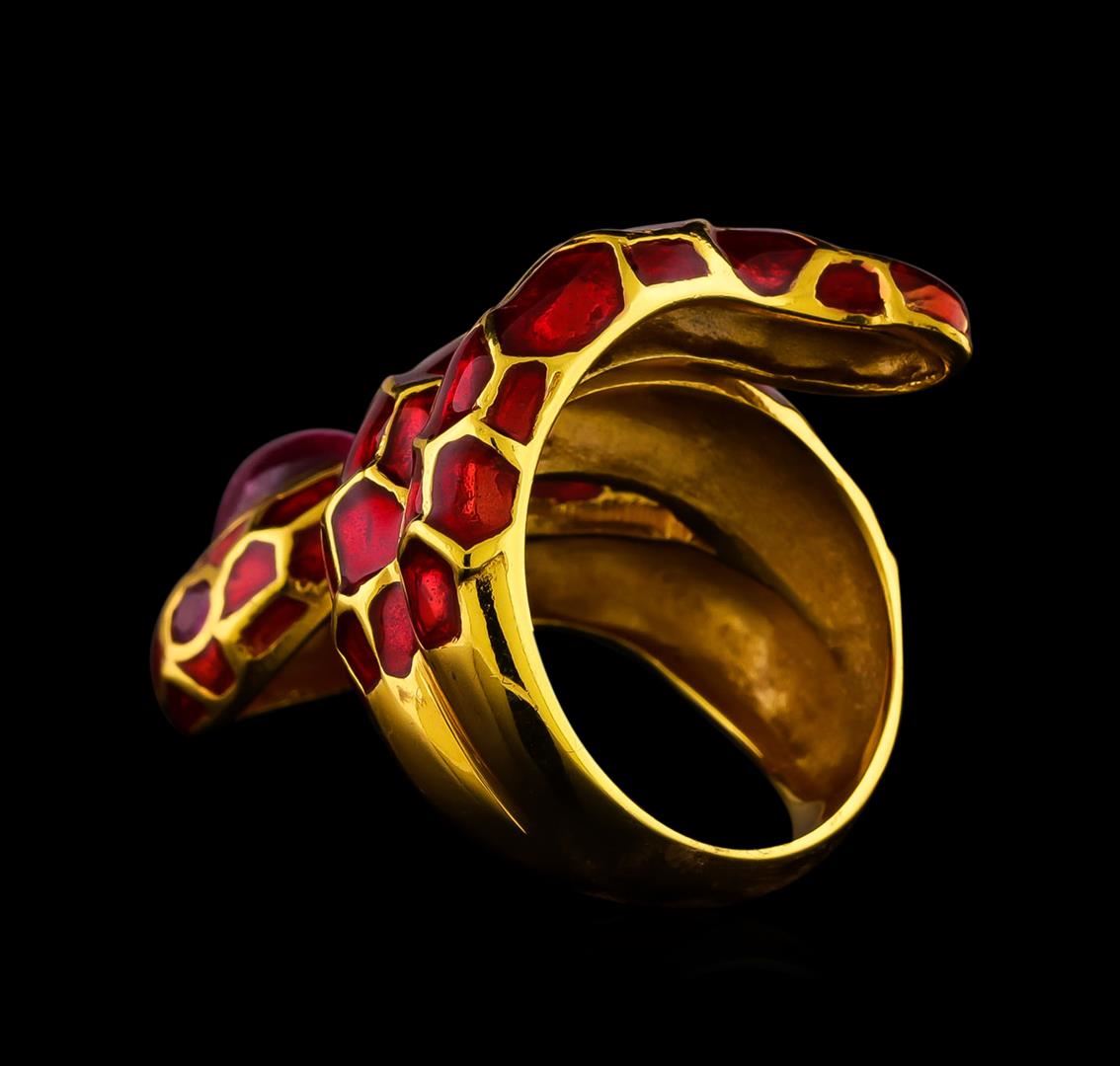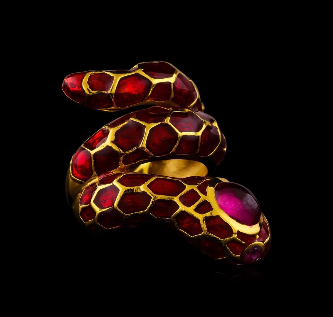 One of a kind high fashion sterling silver Ring weighing 12.7 grams. Containing: Ruby, Red Enamel Inlay. This sterling silver promises a lasting shine.