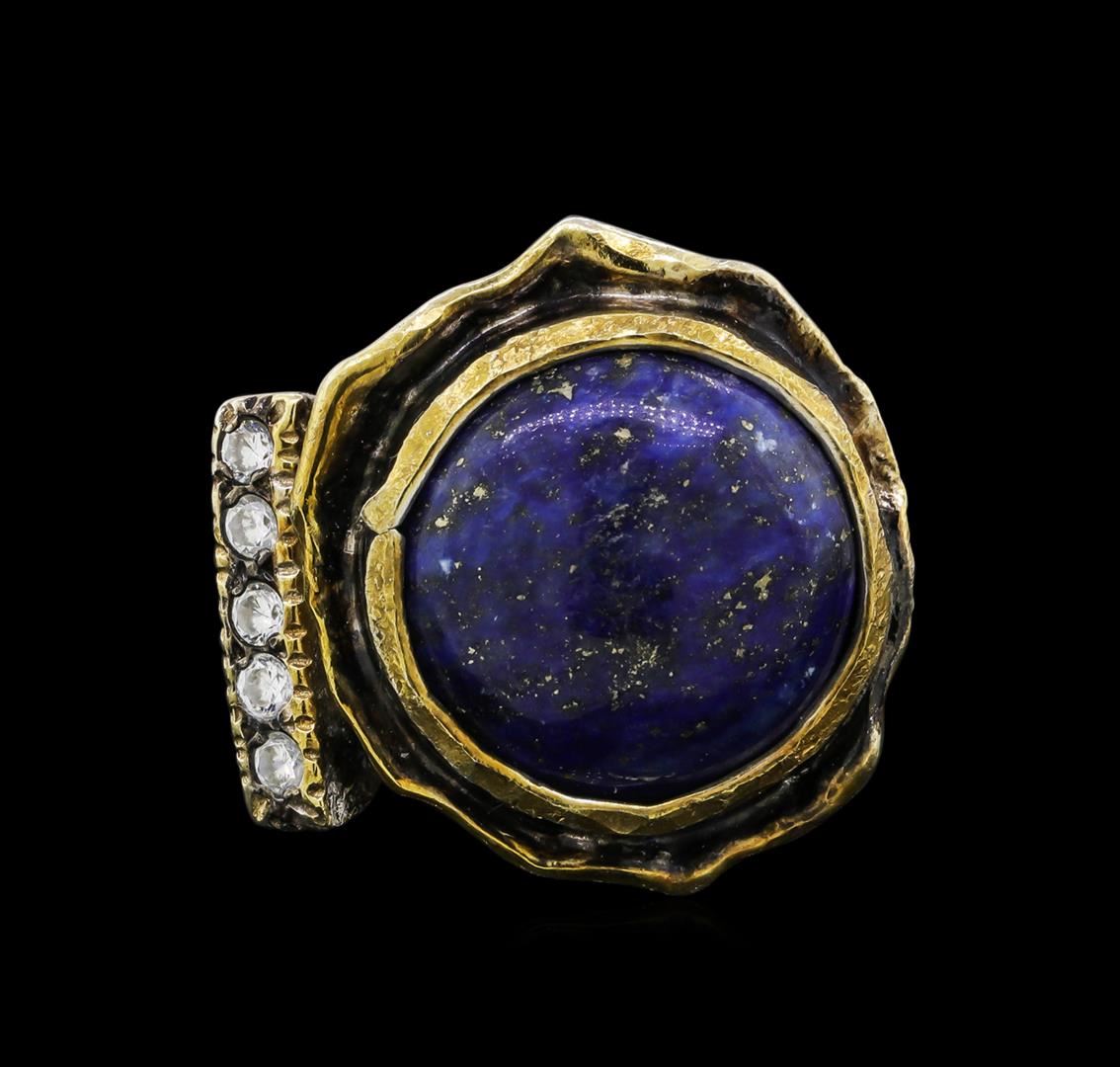 One of a kind high fashion sterling silver Ring weighing 24.1 grams. Black Antique texture. Containing: Lapis, White Crystal. This sterling silver promises a lasting shine.