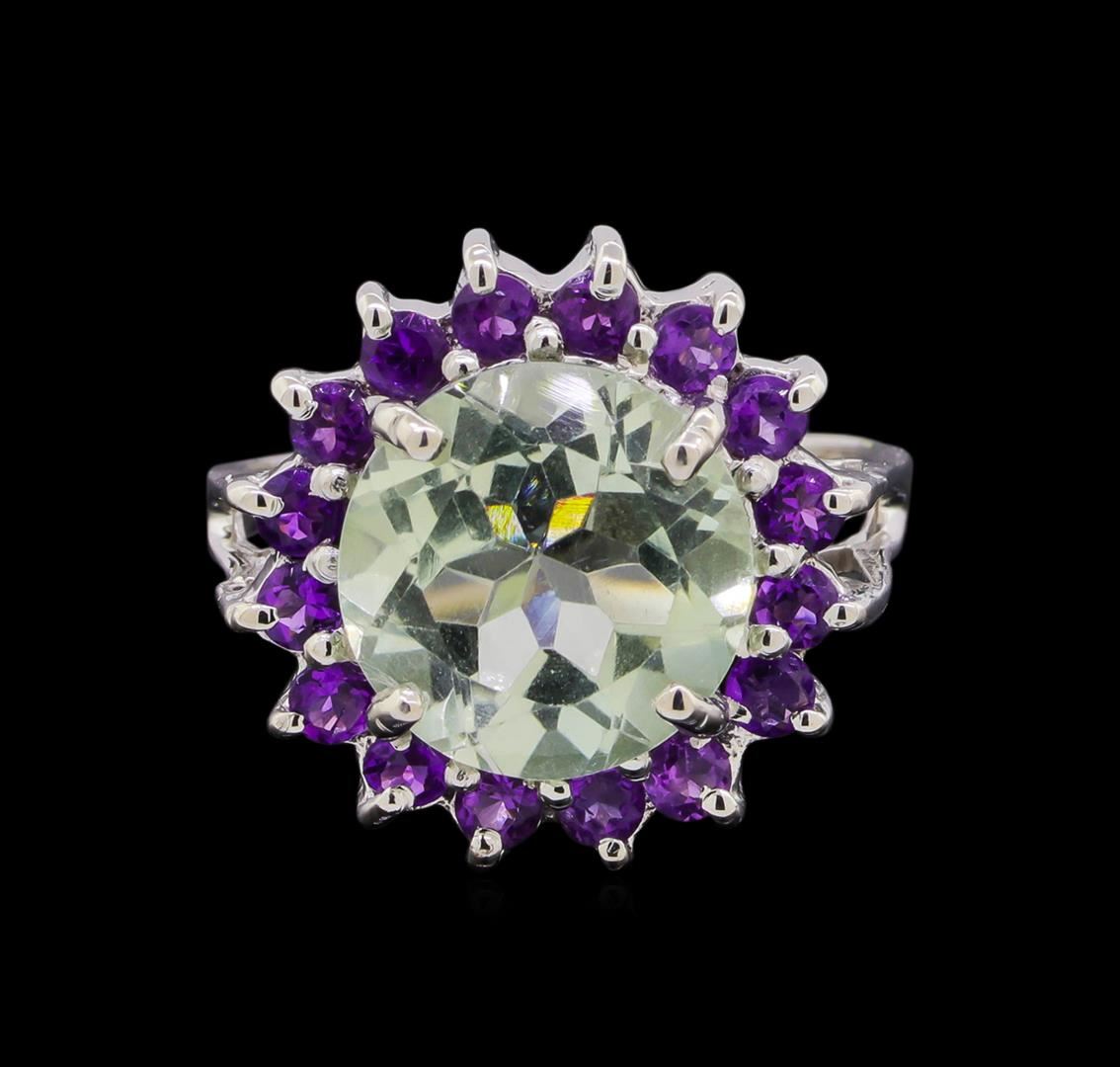One of a kind high fashion sterling silver Ring weighing 6.9 grams. Containing: Green Quartz, Amethyst. This sterling silver promises a lasting shine.